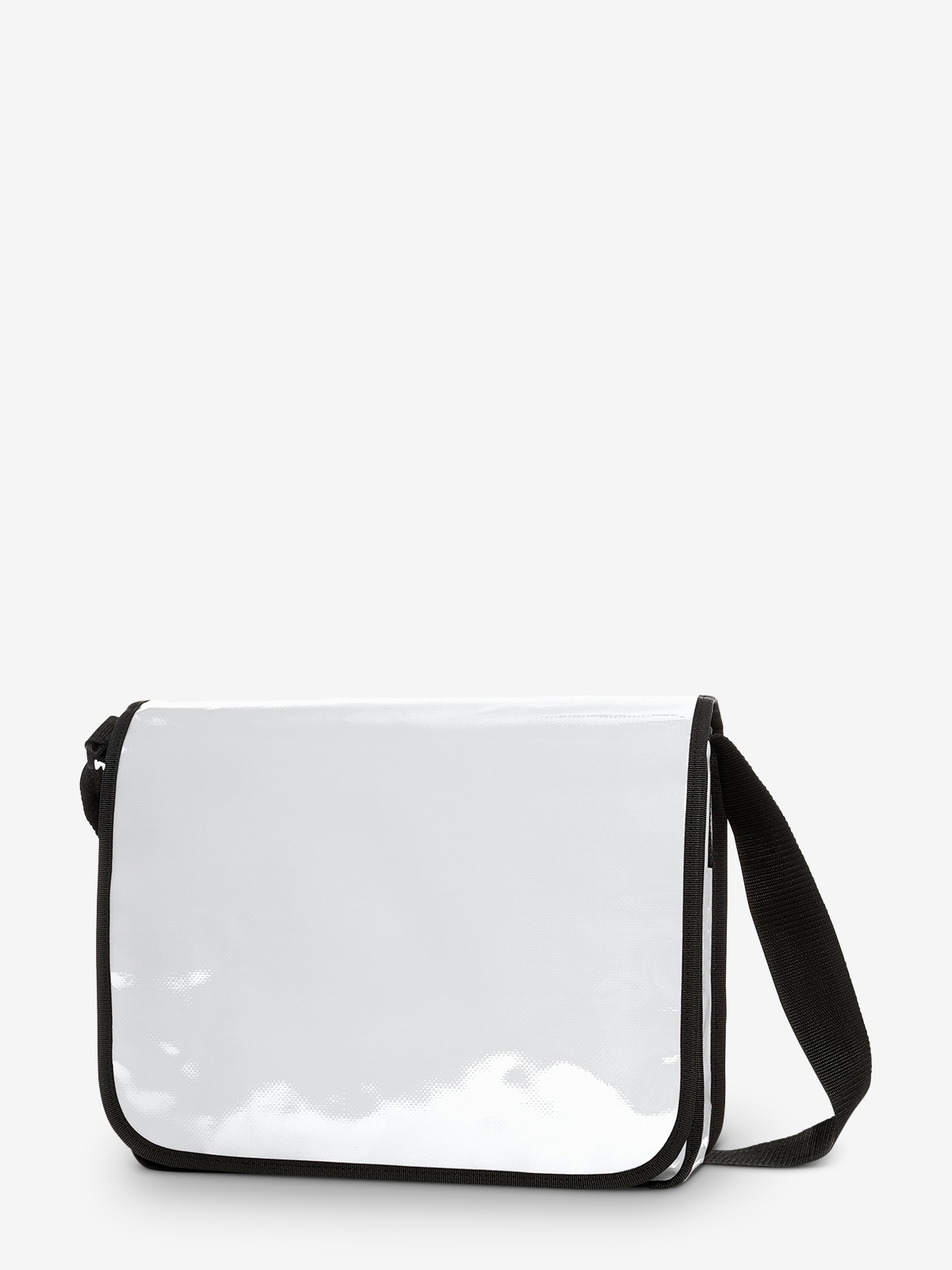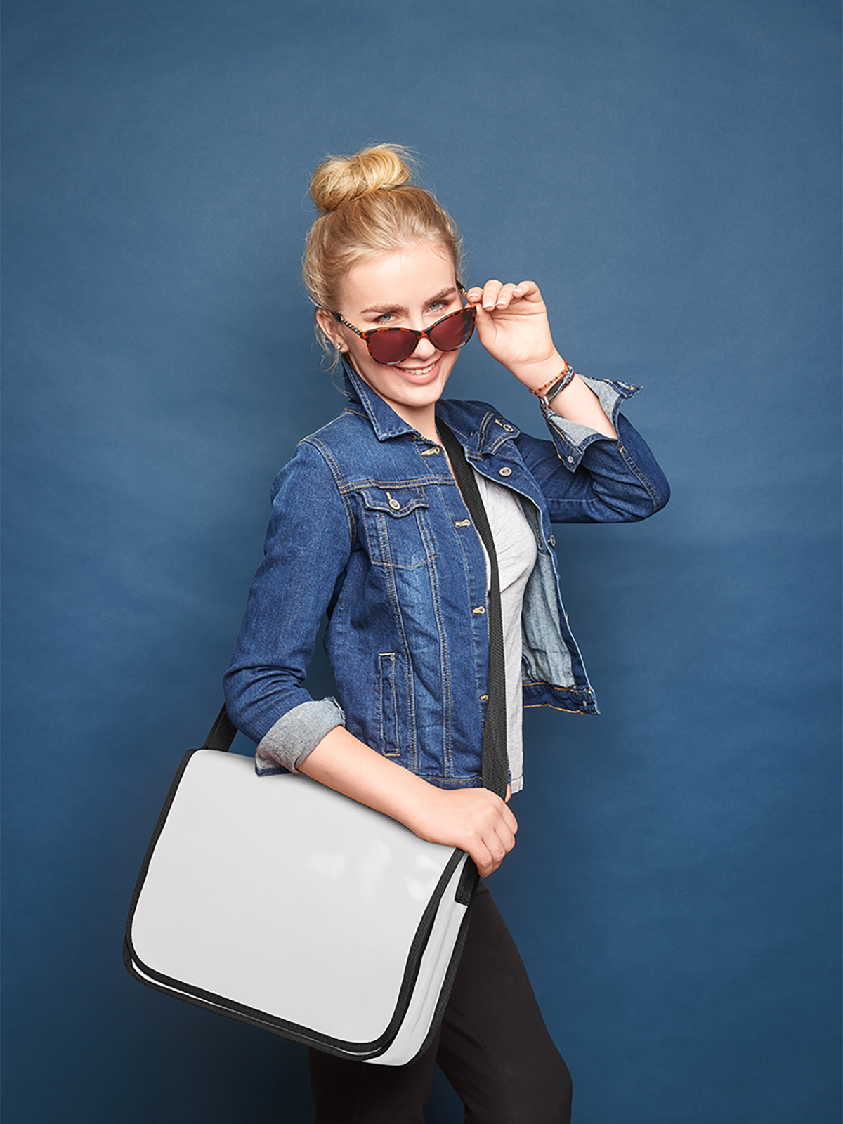 spacious main compartment with organizer features and flat inside pocket; wide shoulder strap; large flap (i.e. large decoration area) with hook and loop tape fastener