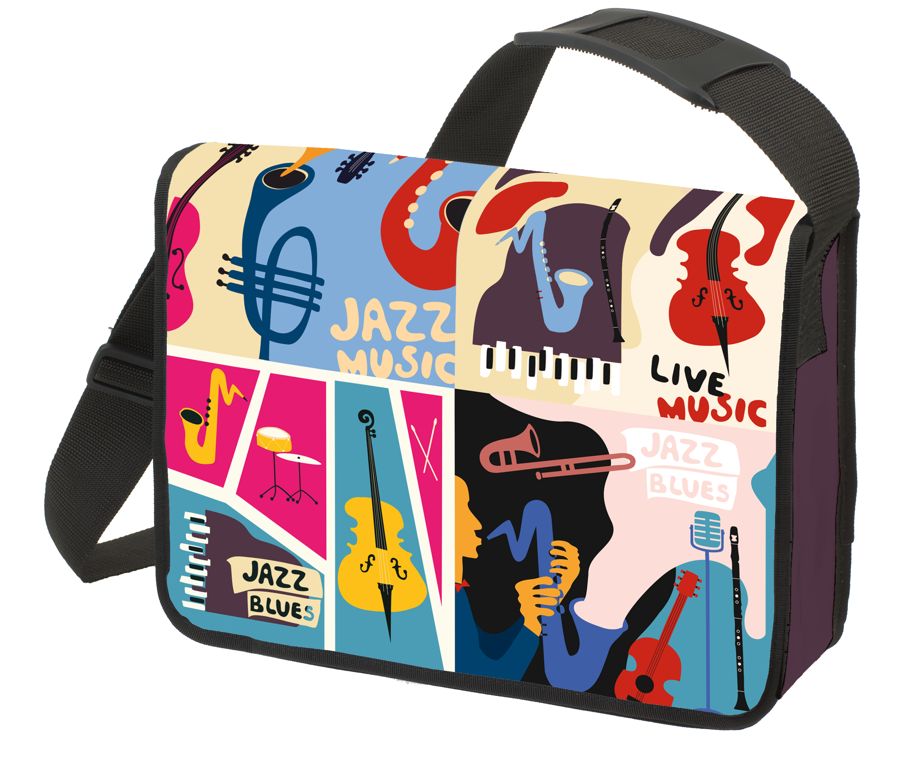 main compartment with flap; hook and loop tape fastener; adjustable shoulder strap with shoulder pad