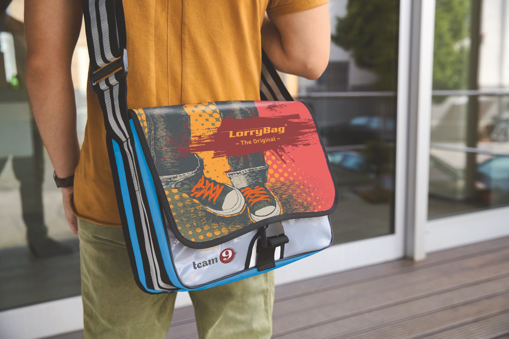 main compartment with large, padded flap, notebook compartment, mobile phone pocket with strap for lifting the phone out, inside open pockets, mesh pouches, elastic fixng strap; buckle with decorative trim; extra wide, adjustable shoulder strap framing bottom and side parts. Create your own LorryBag® Original 2 choosing from 40 tarpaulin colours.