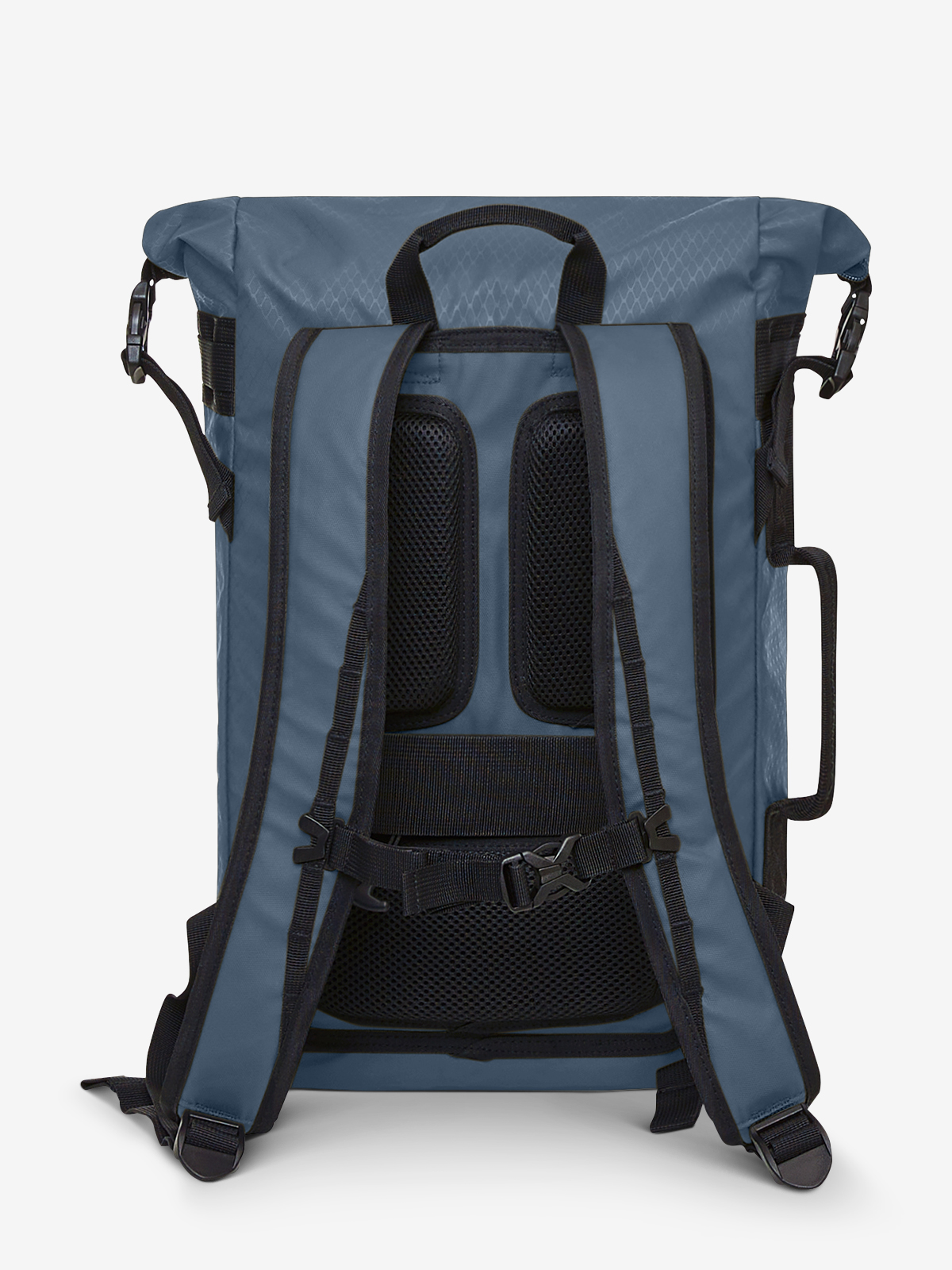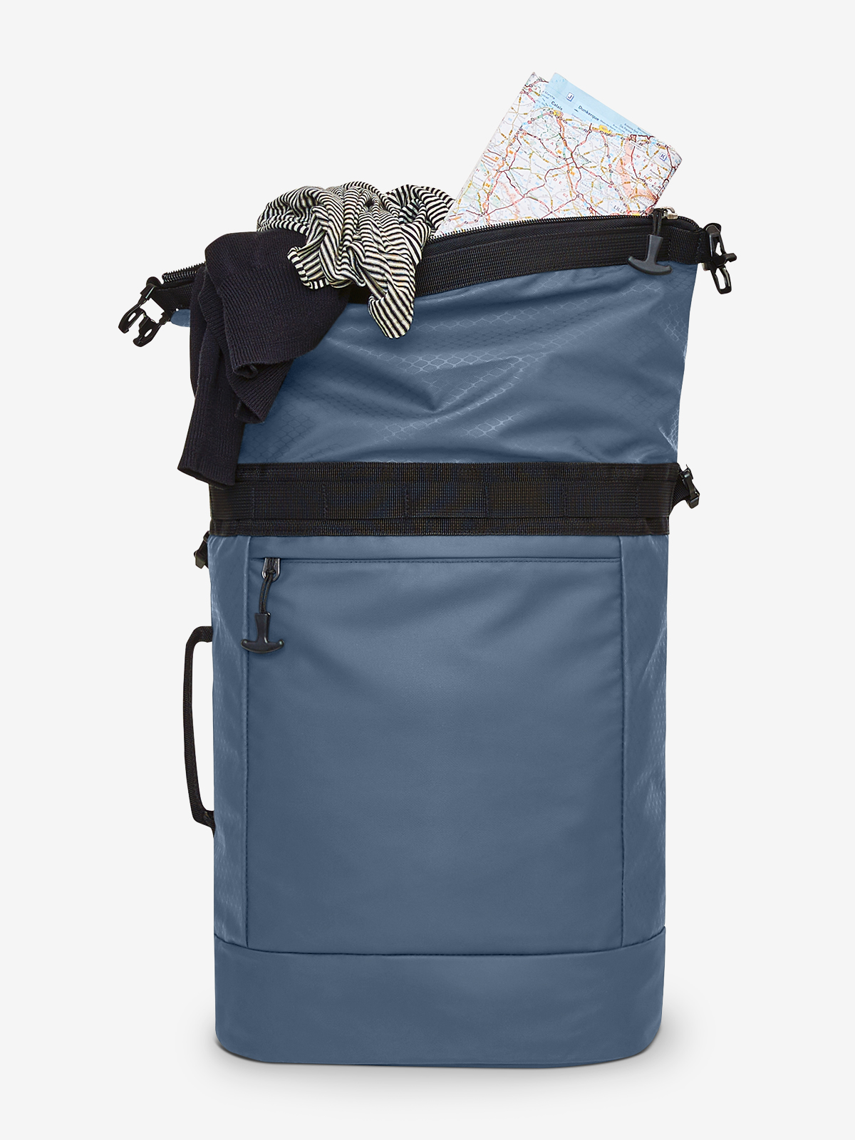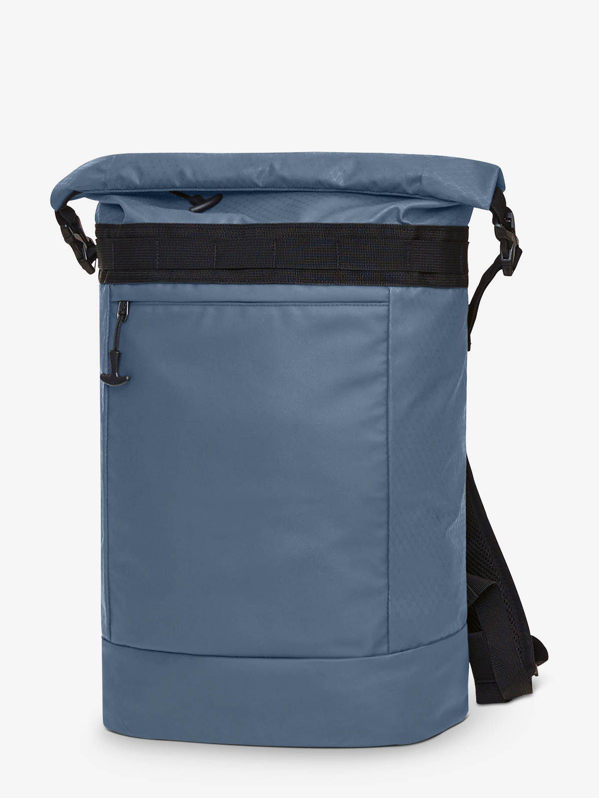 Elaborately made roll-top backpack; zipped main compartment with side buckles; padded slip-in pocket inside; large zipped front pocket; functional strap band on the front; attachment loop for trolley handle on the back; concealed zipped compartment; padded carrying system with height-adjustable chest strap; handle on both sides and back