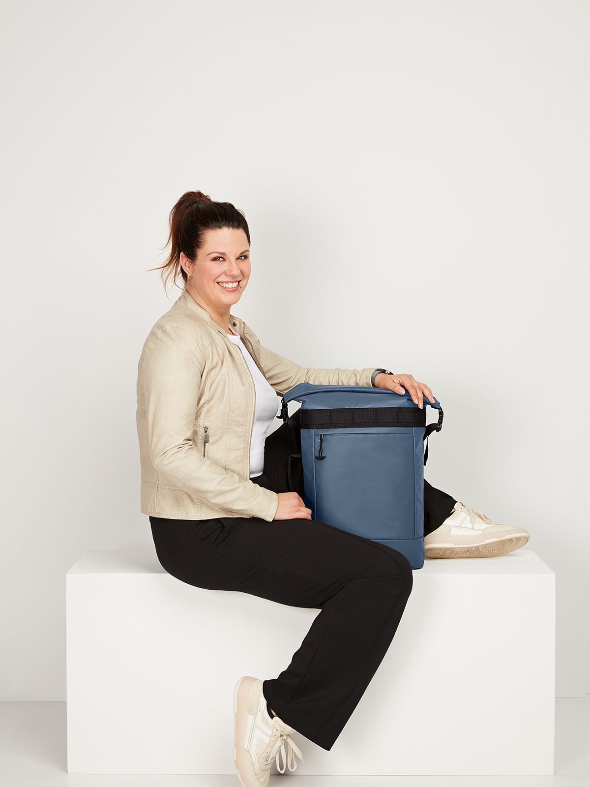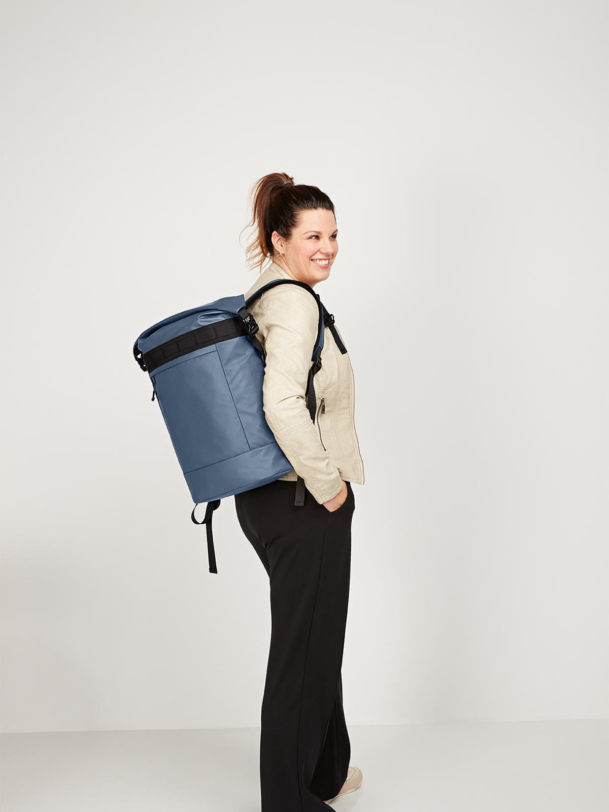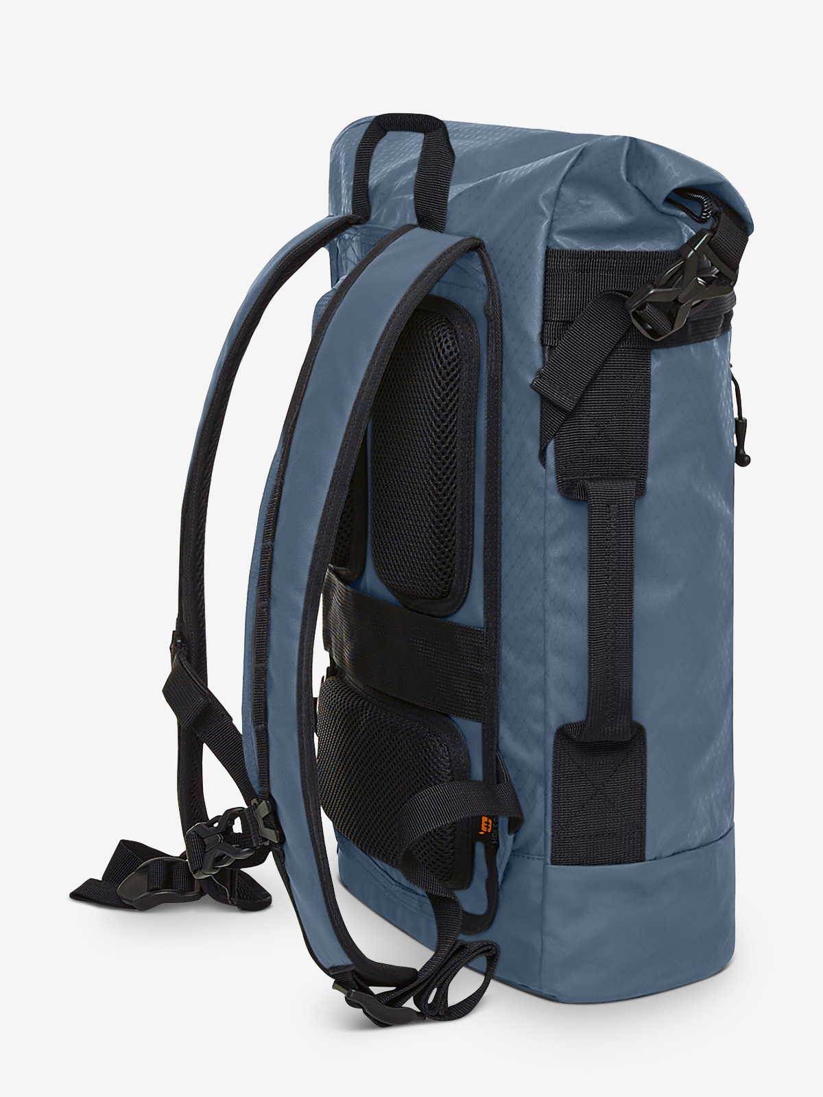Elaborately made roll-top backpack; zipped main compartment with side buckles; padded slip-in pocket inside; large zipped front pocket; functional strap band on the front; attachment loop for trolley handle on the back; concealed zipped compartment; padded carrying system with height-adjustable chest strap; handle on both sides and back