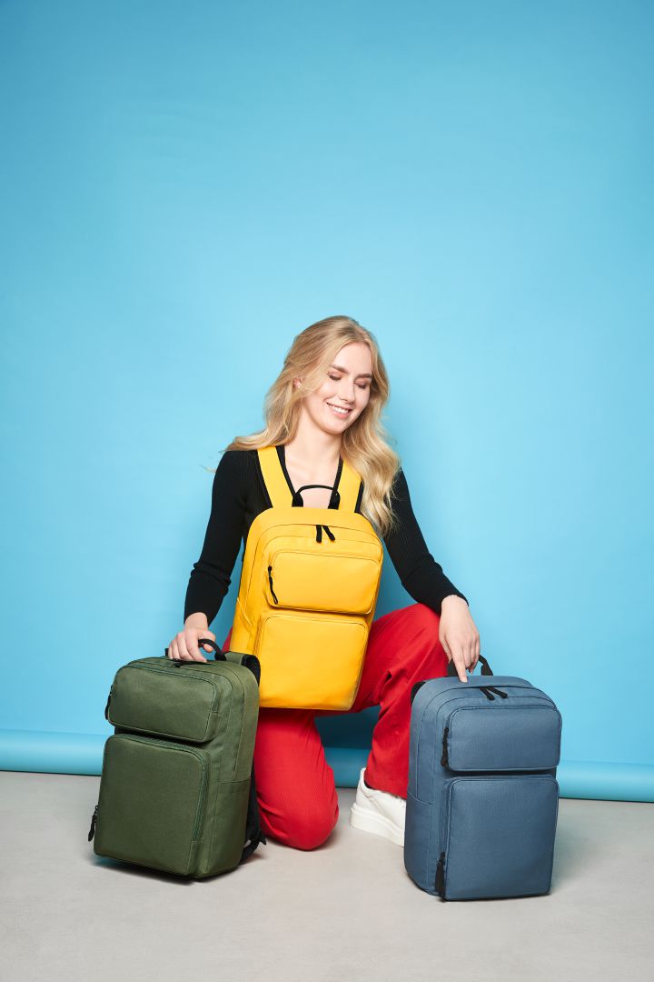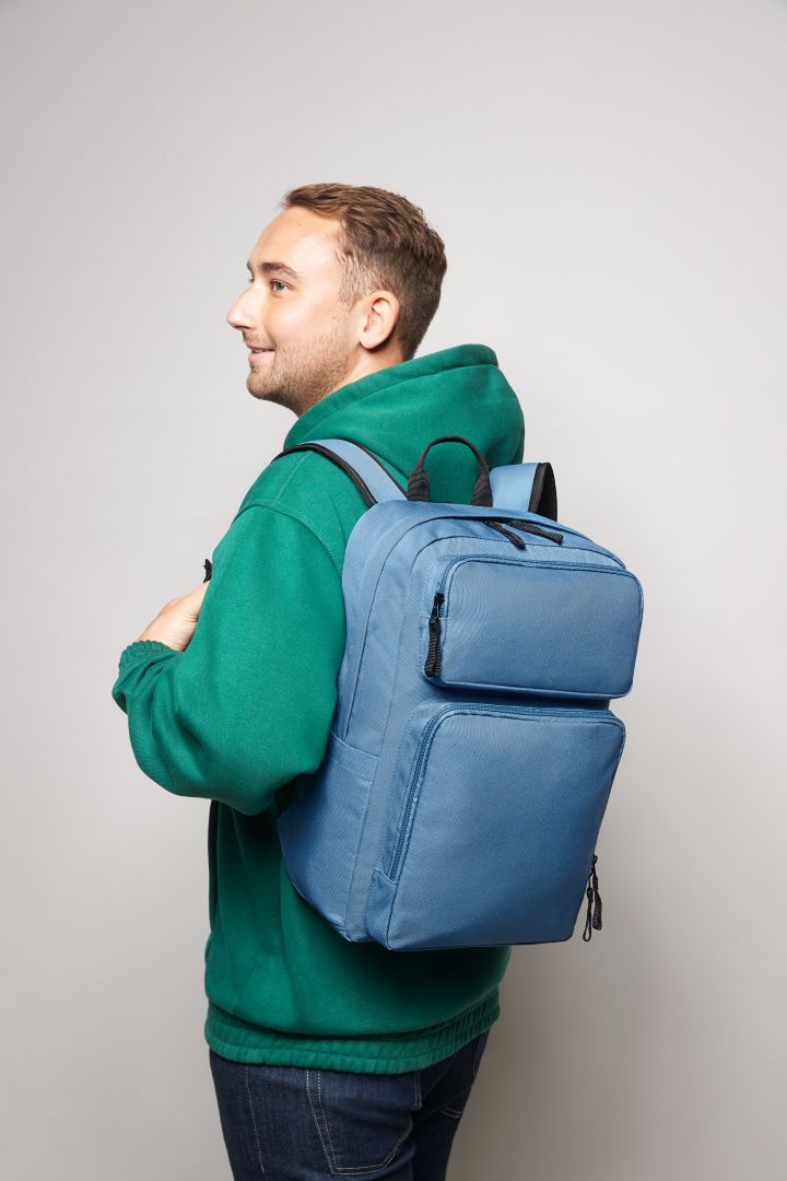 Streamlined shape. Young colours. Beautiful functions. Recycled material. The FELLOW notebook backpack is perfect for university, office, leisure and for anyone who is on the move in an urban and fashionable way. The two patch front pockets are an eye-catcher, providing a geometric cargo style. In addition to the fine aesthetics, it offers hard-hitting function with a padded back, adjustable chest and shoulder straps, flat side pockets and 15-inch notebook compartment. The polyester fabric of the outer fabric is made from recycled PET bottles and is as robust and elegant as you could wish for in your everyday life.
