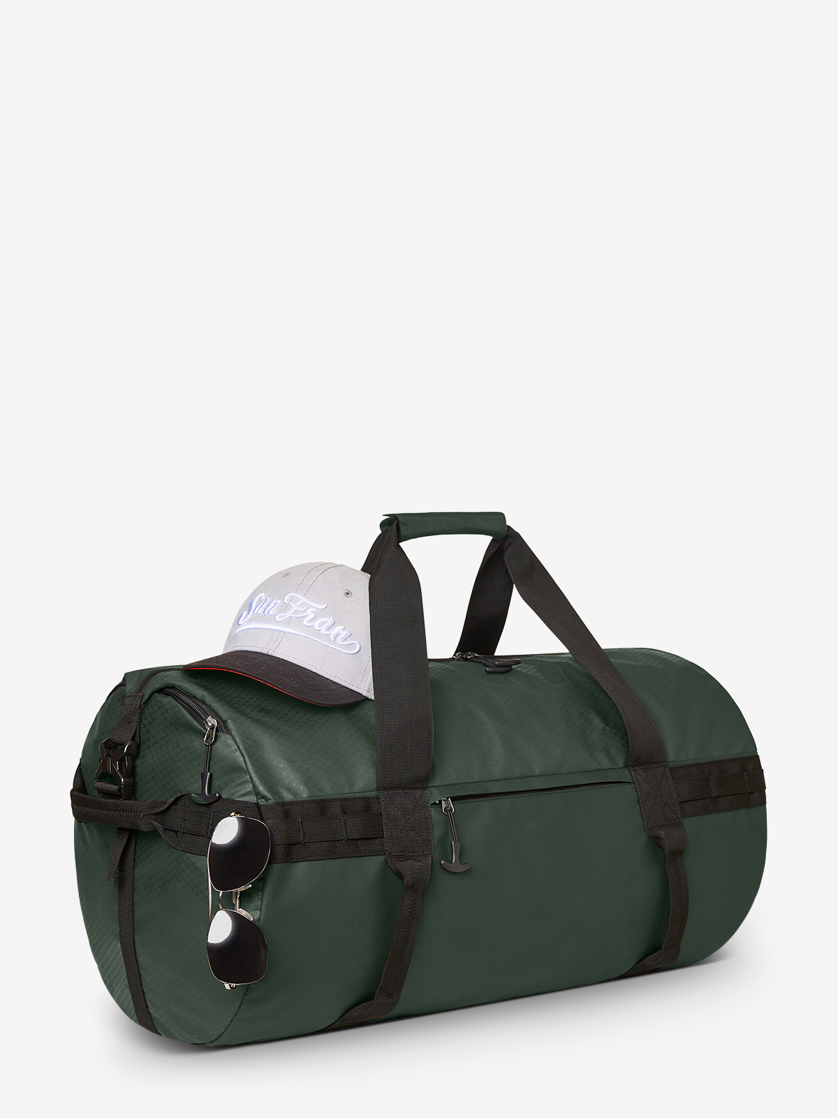 Comfortable sports travel bag with backpack function; spacious main compartment with 2-way zip and side buckles; zipped side pocket; zipped front pocket; all-round functional strap band; various handles; carry handles and concealed, padded and length-adjustable shoulder straps