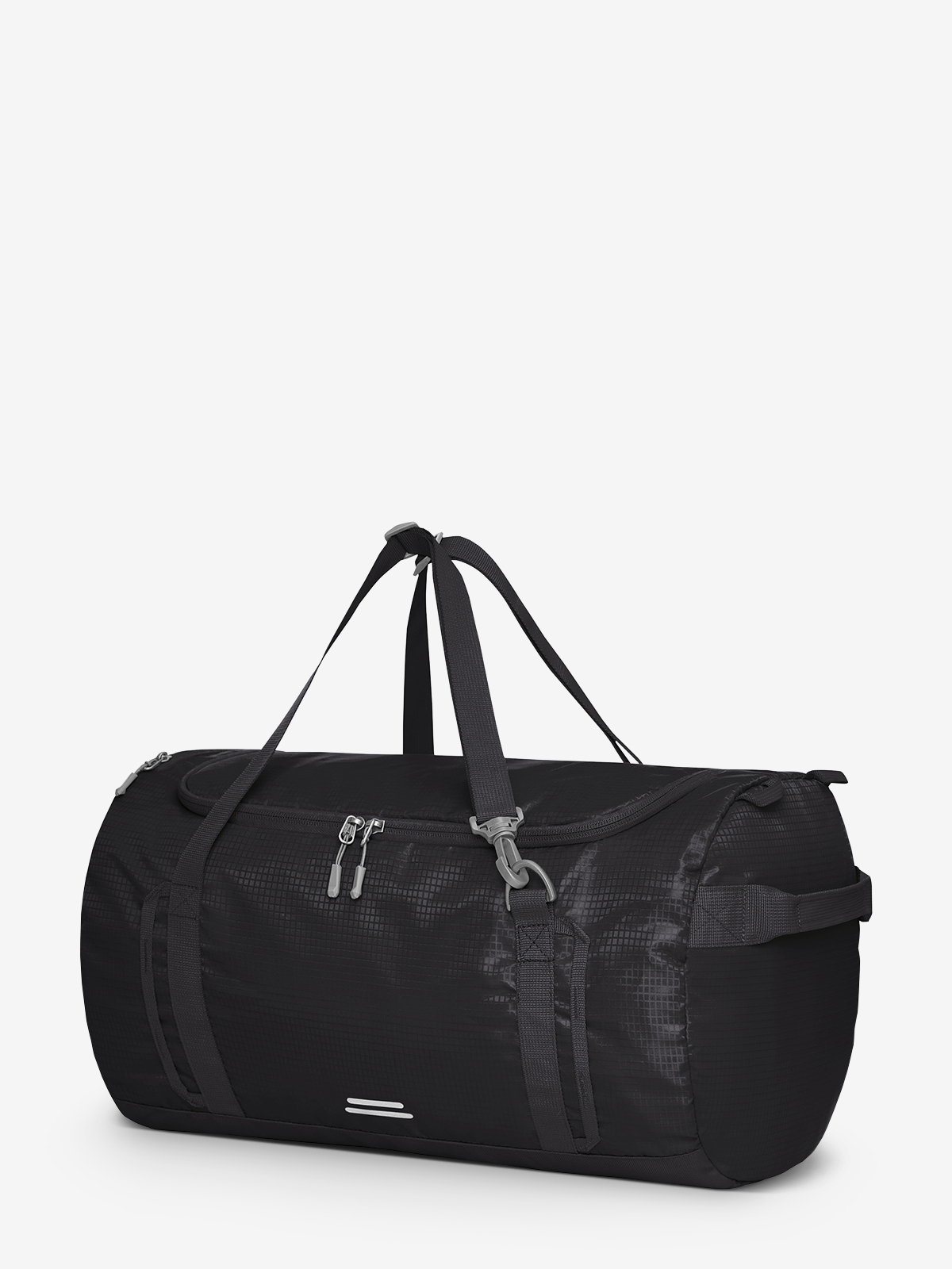 Lightweight, functional sports bag with backpack function; spacious main compartment; large opening with 2-way zip; zipped pocket in the lid; hanging as well as flat zipped pocket inside; zipped pocket on the side; functional strap band; handles on both sides; adjustable carrying handles can also be used as backpack straps; decorative reflective print