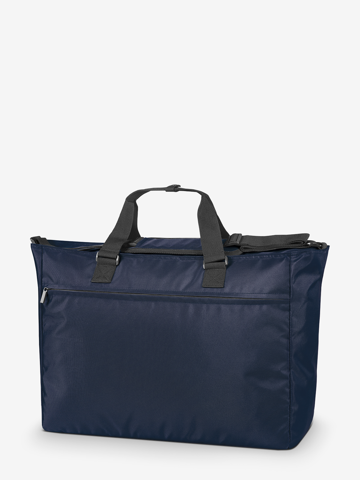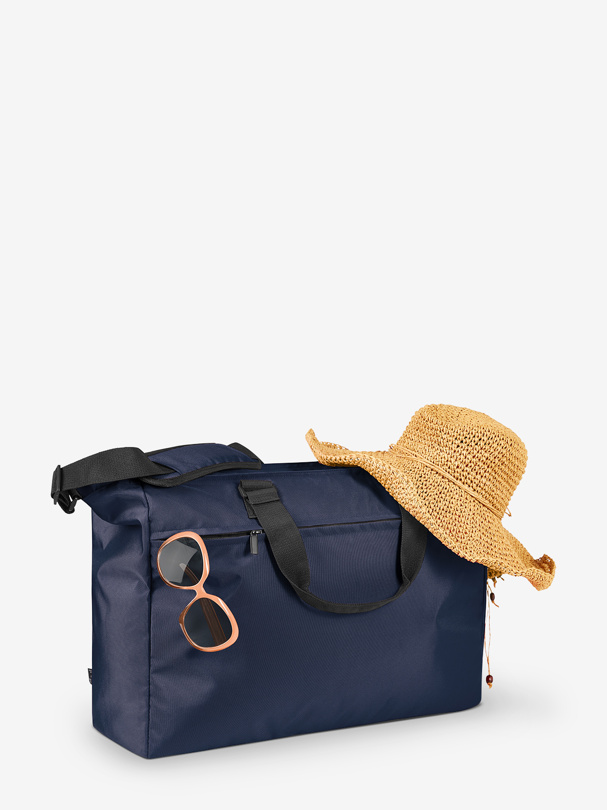 Modern, lightly padded weekender; rPET outer material; large main compartment with 2-way zip; zipped front pocket; flat zipped compartment inside; adjustable shoulder strap on both sides with sewn shoulder pad; handles with press stud cuff