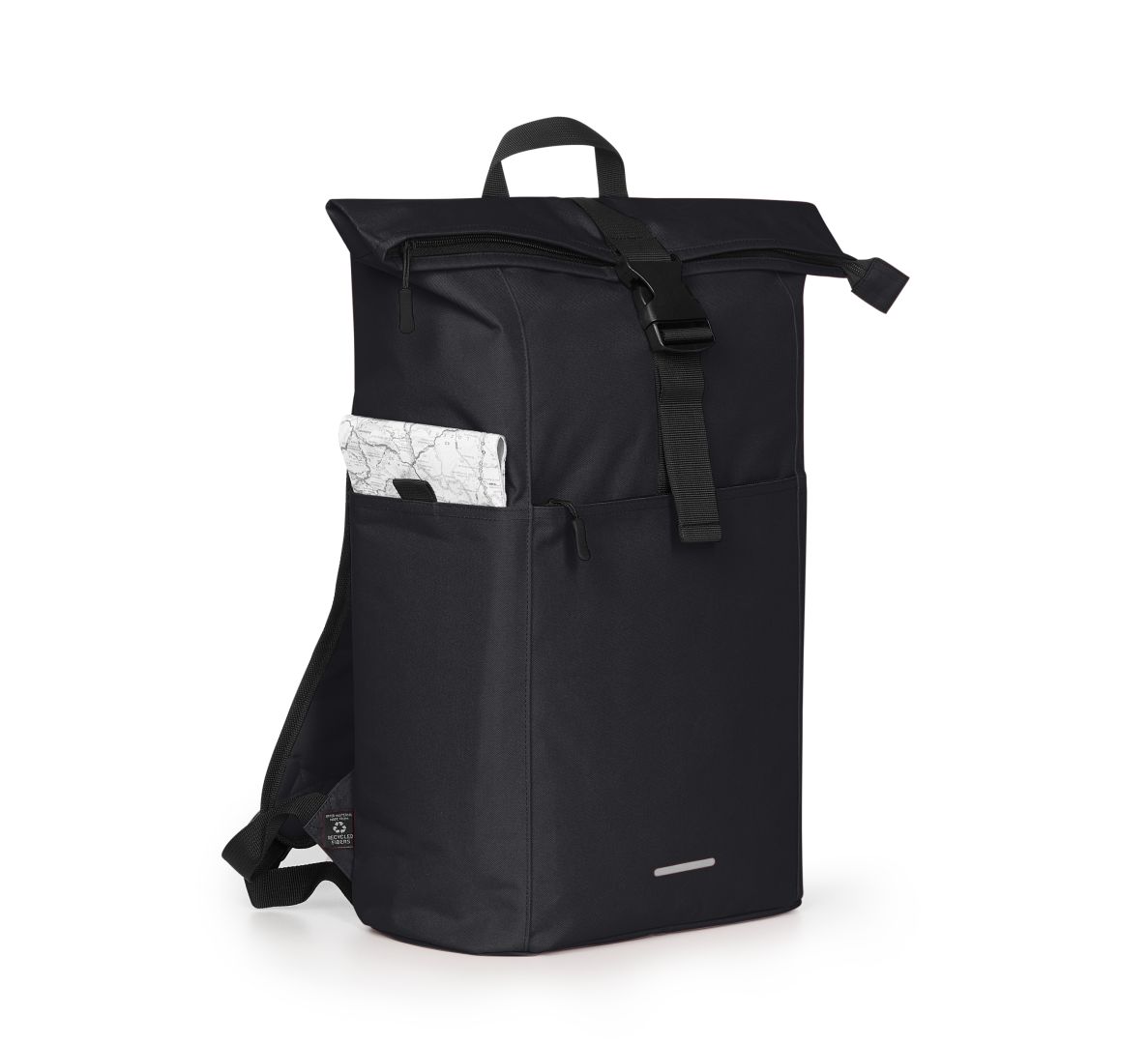 practical roll top rucksack; recycled outer material; large main compartment with zipper and additional press stud; attractive reflective print; RPT outer material; large padded pocket; airtag pocket; large front pocket with zipper; two side pockets, e.g. for a water bottle; padded carrying system; handle