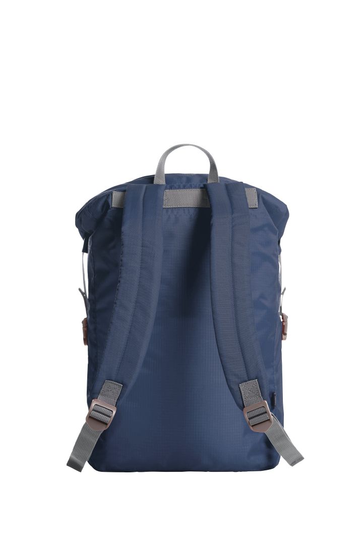 light, water-repellent backpack with wrap closure and hot-sealed seams; side buckles; inner zipper pocket; front zipper pocket; length-adjustable, padded backpack straps; handle