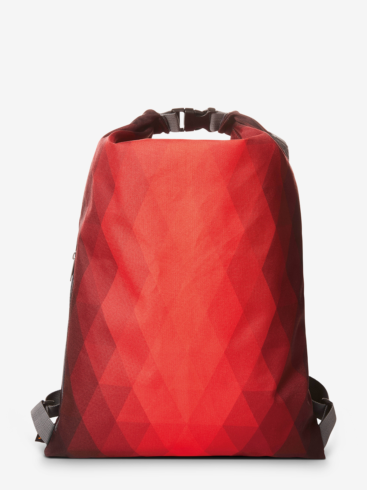 lightweight, innovative backpack with diamond pattern; reversible; zippered main compartment, with additional winding function; side zipper pocket; woven, length-adjustable shoulder straps