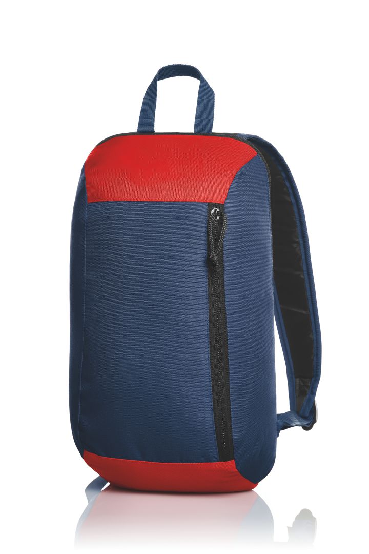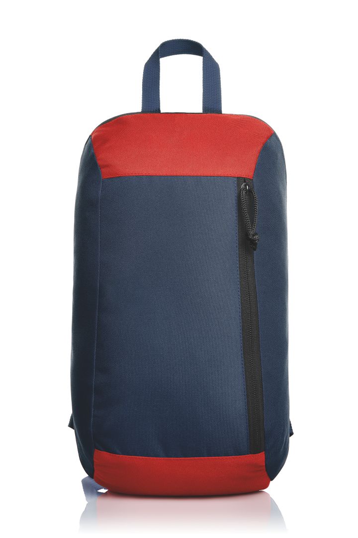 sporty, light-weight backpack with front zipper pocket; zipper main compartment; padded back and shoulder straps; carrying handle