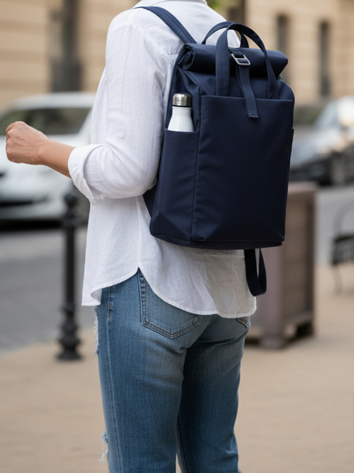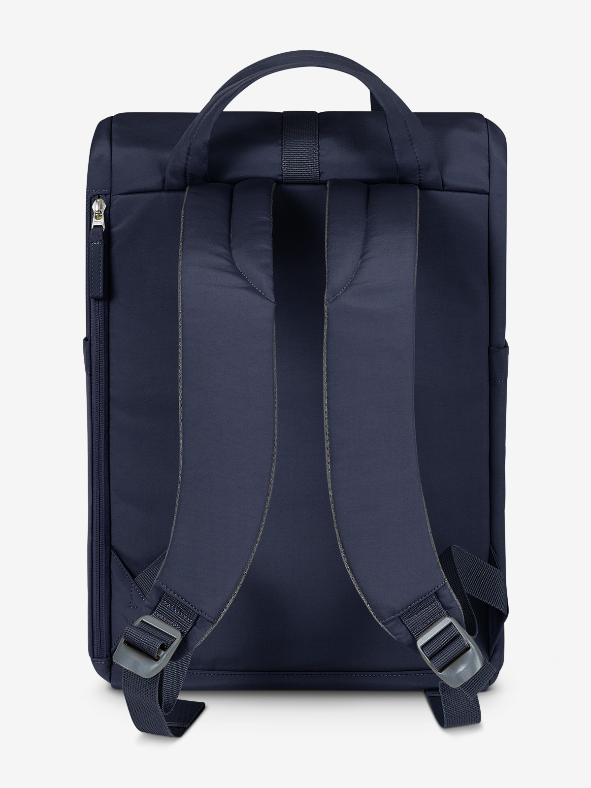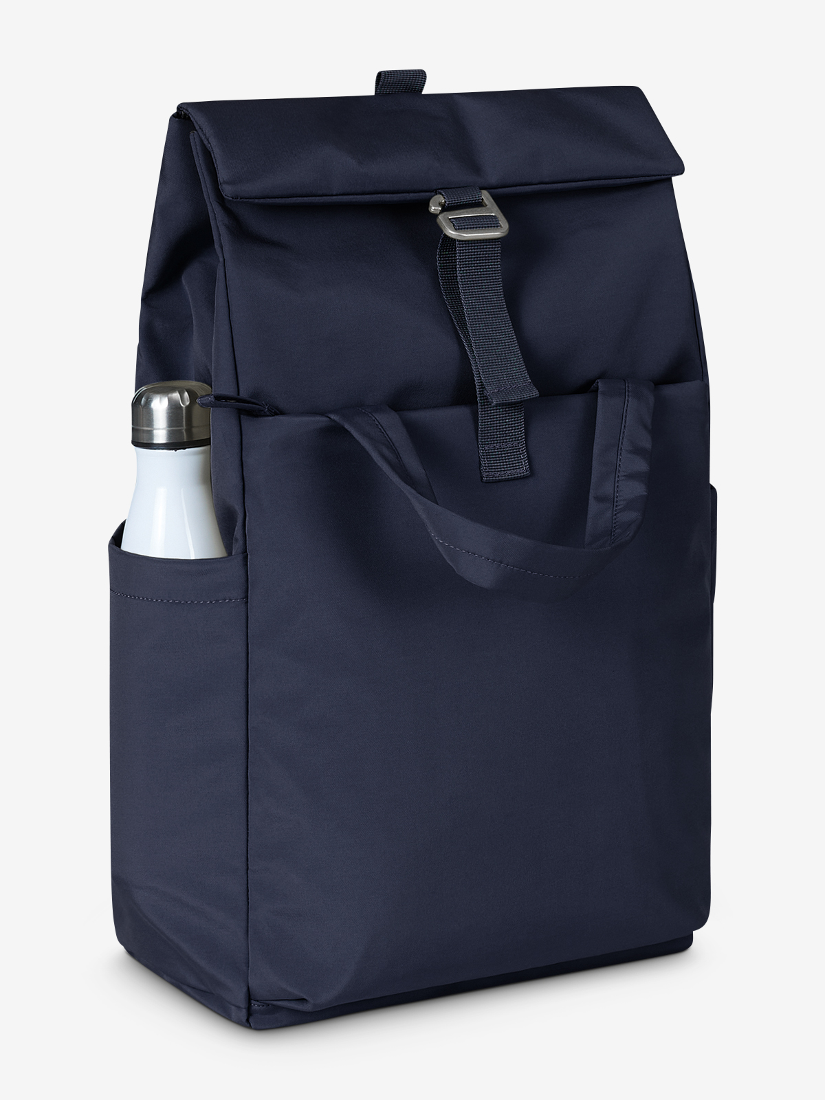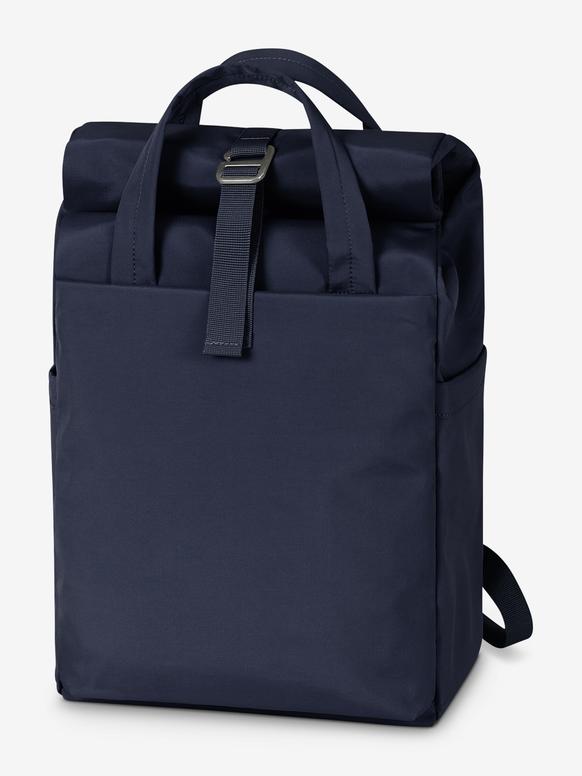 attractive leisure backpack with roll-up closure, premium metal buckle and sewn handles; volume expansion; main compartment with padded equipment compartment; large zipped front pocket; two side slip-in pockets; large zipped side compartment on the back; well-padded carrying system