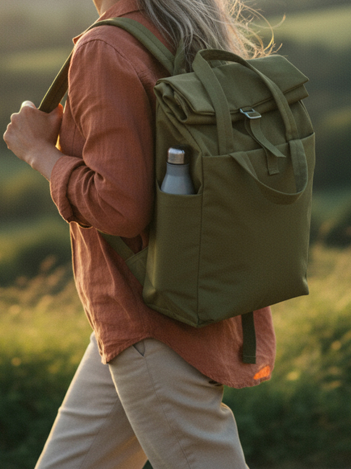 attractive leisure backpack with roll-up closure, premium metal buckle and sewn handles; volume expansion; main compartment with padded equipment compartment; large zipped front pocket; two side slip-in pockets; large zipped side compartment on the back; well-padded carrying system