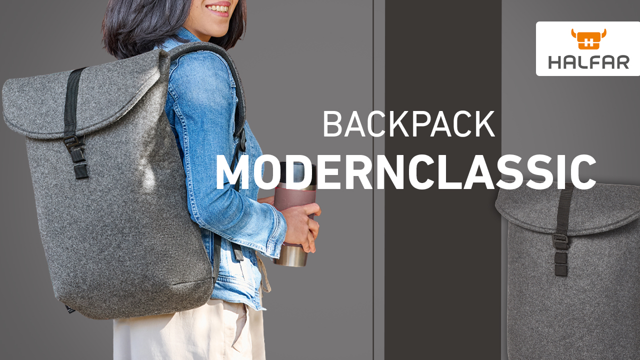 What do you really need? This felt backpack answers this question in its own fine way. Pleasantly minimalist in material and features. Decadent in quality and design. The MODERNCLASSIC is therefore made from synthetic recycled felt. For one, it exudes plenty of warmth, which is pleasant to the touch and nice to carry on your back. Secondly, the material makes it a resource-saving, long-lasting product - and an extremely elegant one as well. The linear shape shows off the material and finish to their best advantage. And the background also allows the high-quality metal clasp to really shine. The back of the MODERNCLASSIC backpack is unexpectedly exciting: it is elaborately padded, and the spacer fabric provides plenty of carrying comfort.