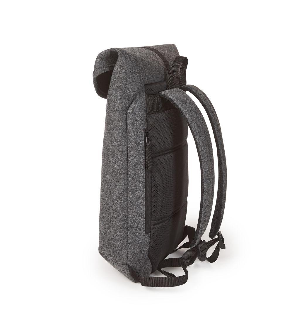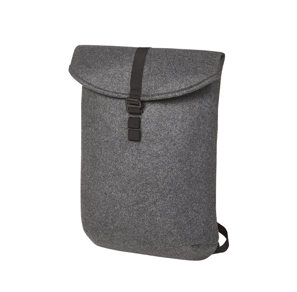backpack made of fine felt; recycled outer material; adjustable closure with loop strap and metal buckles; padded equipment compartment; padded carrying system with adjustable shoulder straps; concealed zippered pocket on back; handle