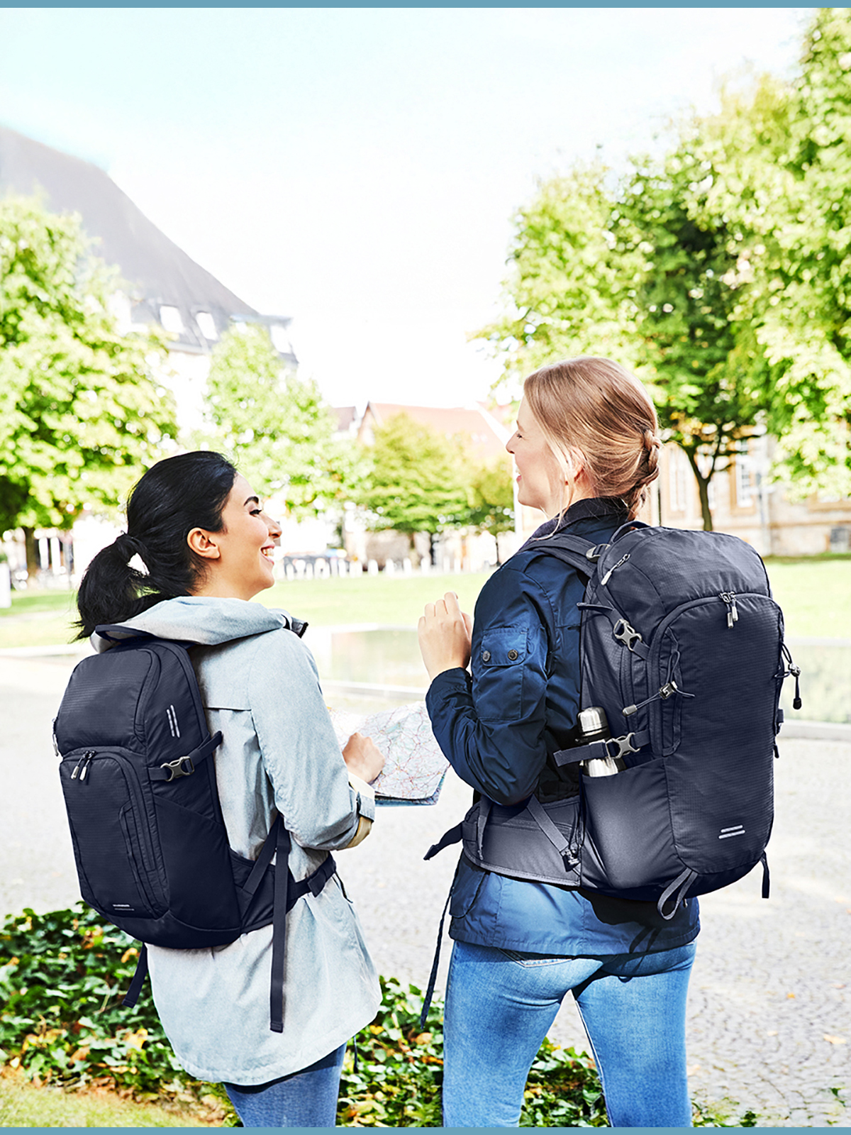 Lightweight, functional backpack with ergonomically shaped back and innovative honeycomb back system for ideal ventilation and padding; height-adjustable at the top and bottom for a perfect fit; height-adjustable chest belt; padded pelvic strap with zipped pockets; large 2-way zipped main compartment with flat slip-in pocket inside; rear port suitable for headphones or tube of the optional hydration system (item 1812216); hook-and-loop strap for fixing the hydration tube; 2 zipped front pockets; 2 mesh side pockets; side lashing straps; functional strap band on the front pocket; decorative reflective print; trekking pole fixation, base compartment with rain cover; hand grip