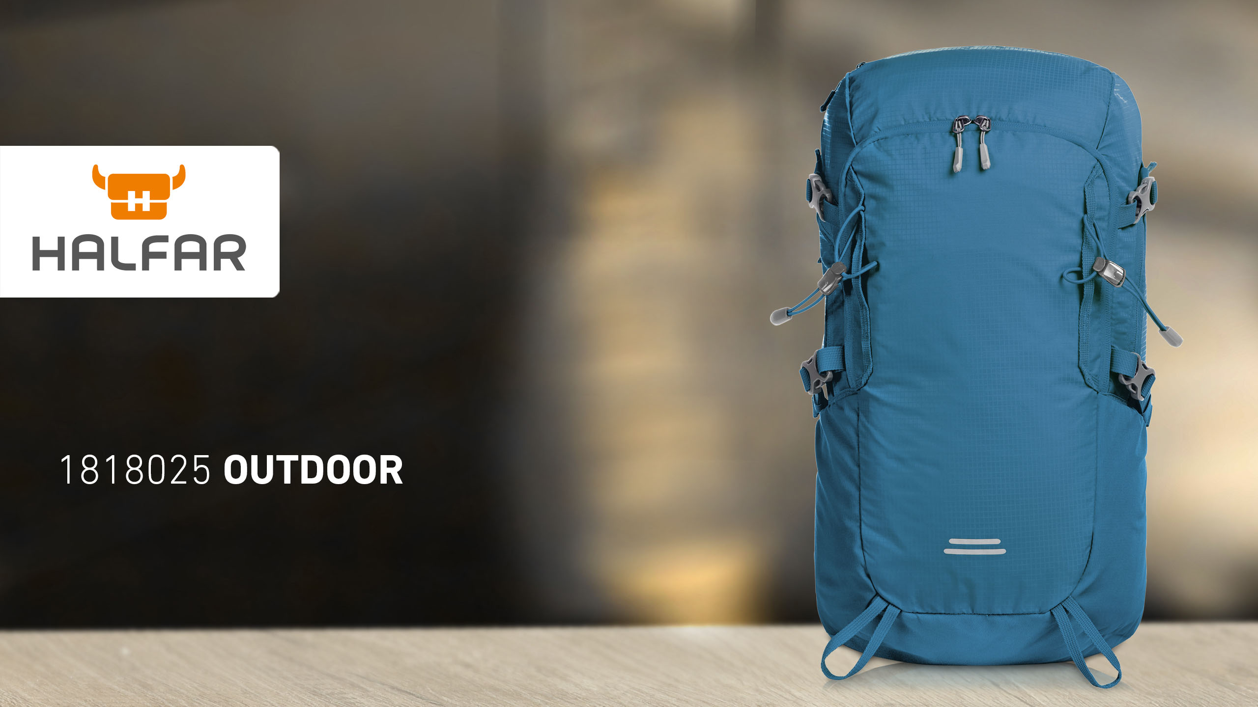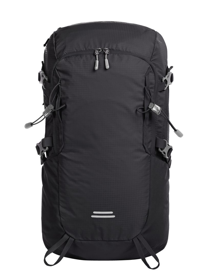Lightweight, functional backpack with ergonomically shaped back and innovative honeycomb back system for ideal ventilation and padding; height-adjustable at the top and bottom for a perfect fit; height-adjustable chest belt; padded pelvic strap with zipped pockets; large 2-way zipped main compartment with flat slip-in pocket inside; rear port suitable for headphones or tube of the optional hydration system (item 1812216); hook-and-loop strap for fixing the hydration tube; 2 zipped front pockets; 2 mesh side pockets; side lashing straps; functional strap band on the front pocket; decorative reflective print; trekking pole fixation, base compartment with rain cover; hand grip