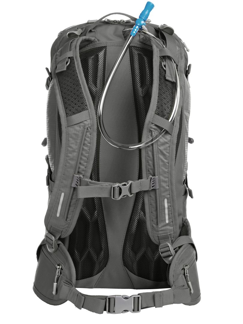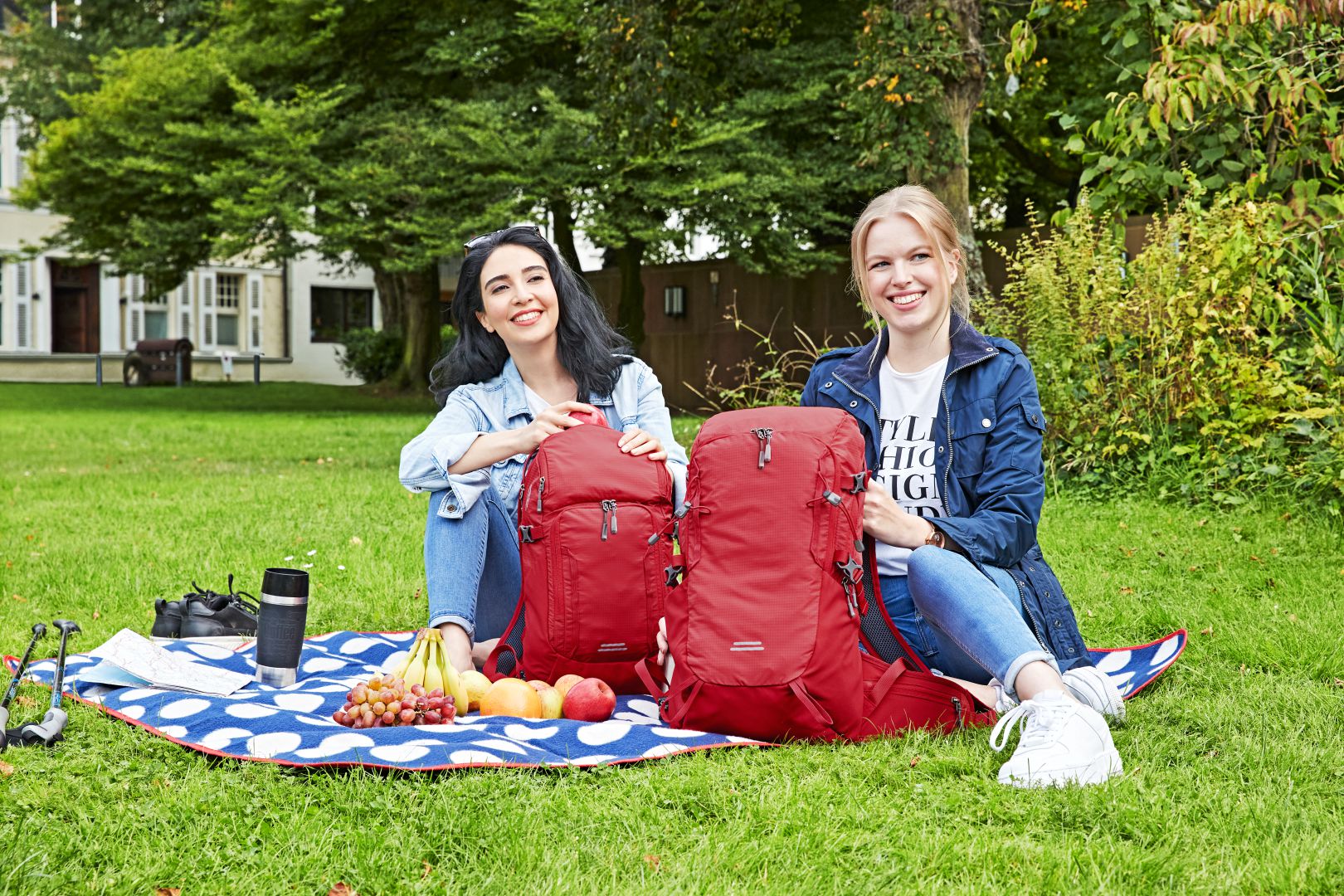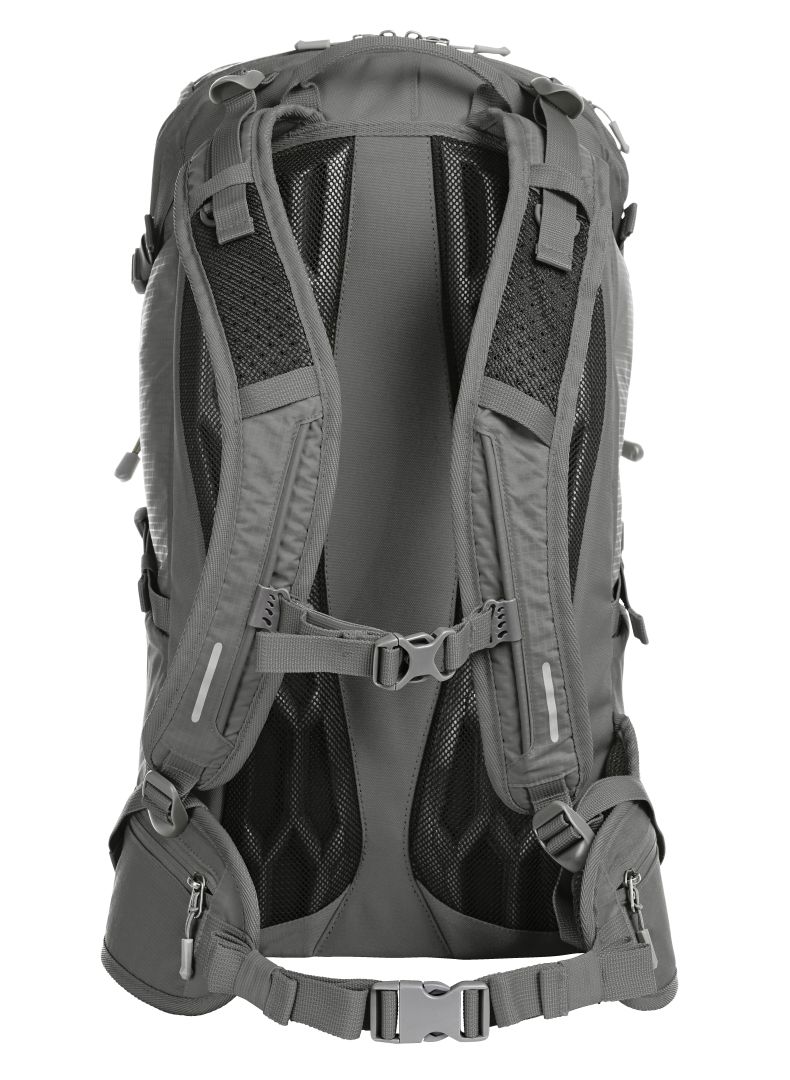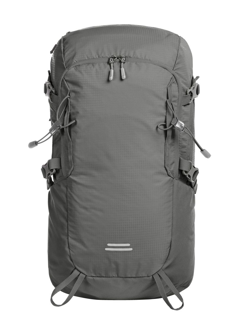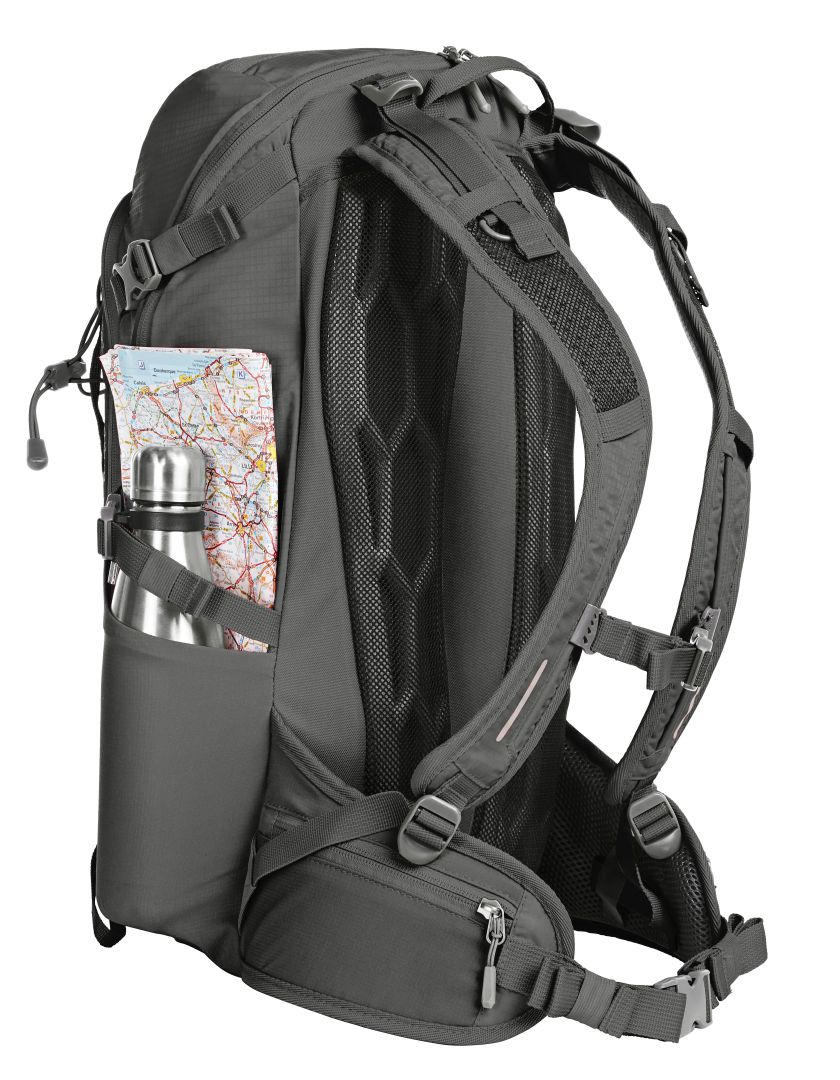 Lightweight, functional backpack with ergonomically shaped back and innovative honeycomb back system for ideal ventilation and padding; height-adjustable at the top and bottom for a perfect fit; height-adjustable chest belt; padded pelvic strap with zipped pockets; large 2-way zipped main compartment with flat slip-in pocket inside; rear port suitable for headphones or tube of the optional hydration system (item 1812216); hook-and-loop strap for fixing the hydration tube; 2 zipped front pockets; 2 mesh side pockets; side lashing straps; functional strap band on the front pocket; decorative reflective print; trekking pole fixation, base compartment with rain cover; hand grip