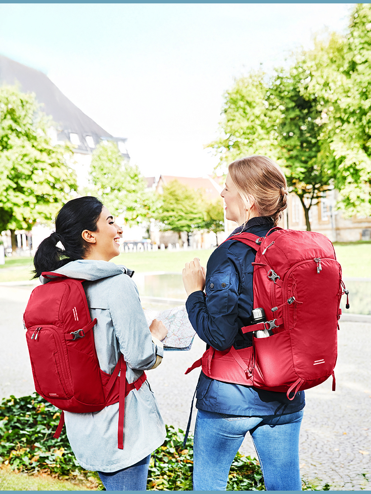 Lightweight, functional backpack with ergonomically shaped back and innovative honeycomb back system for ideal ventilation and padding; height-adjustable at the top and bottom for a perfect fit; height-adjustable chest belt; padded pelvic strap with zipped pockets; large 2-way zipped main compartment with flat slip-in pocket inside; rear port suitable for headphones or tube of the optional hydration system (item 1812216); hook-and-loop strap for fixing the hydration tube; 2 zipped front pockets; 2 mesh side pockets; side lashing straps; functional strap band on the front pocket; decorative reflective print; trekking pole fixation, base compartment with rain cover; hand grip