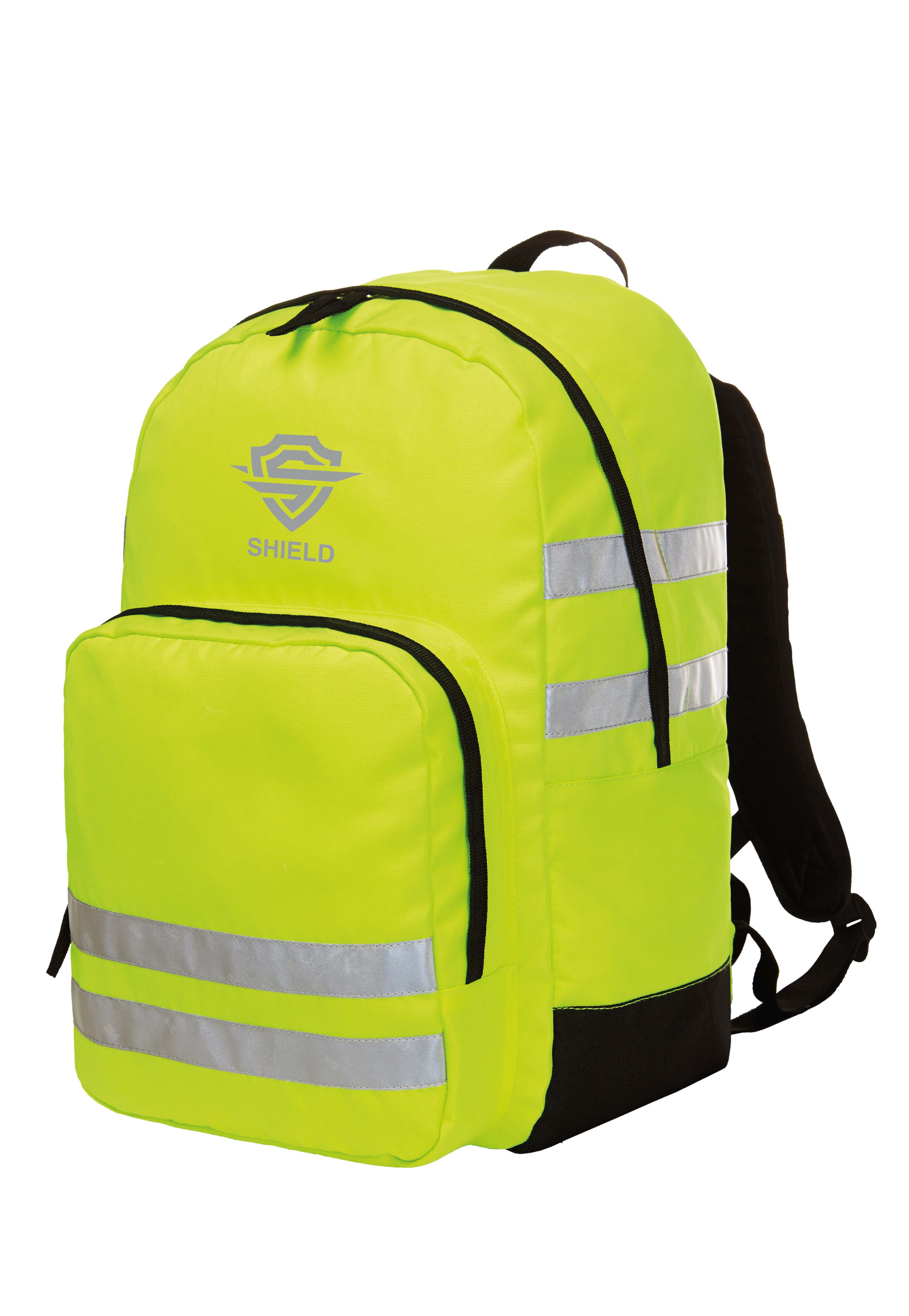 large main compartment with 2-way zipper and rain flap; interior mesh pocket, padded pouch; headphone output; front pocket with 2-way zipper, rain flap and organizer; handle; padded back and shoulder straps; height-adjustable chest strap; bright neon yellow body fabric with 3M™ Scotchlite™ reflective stripes