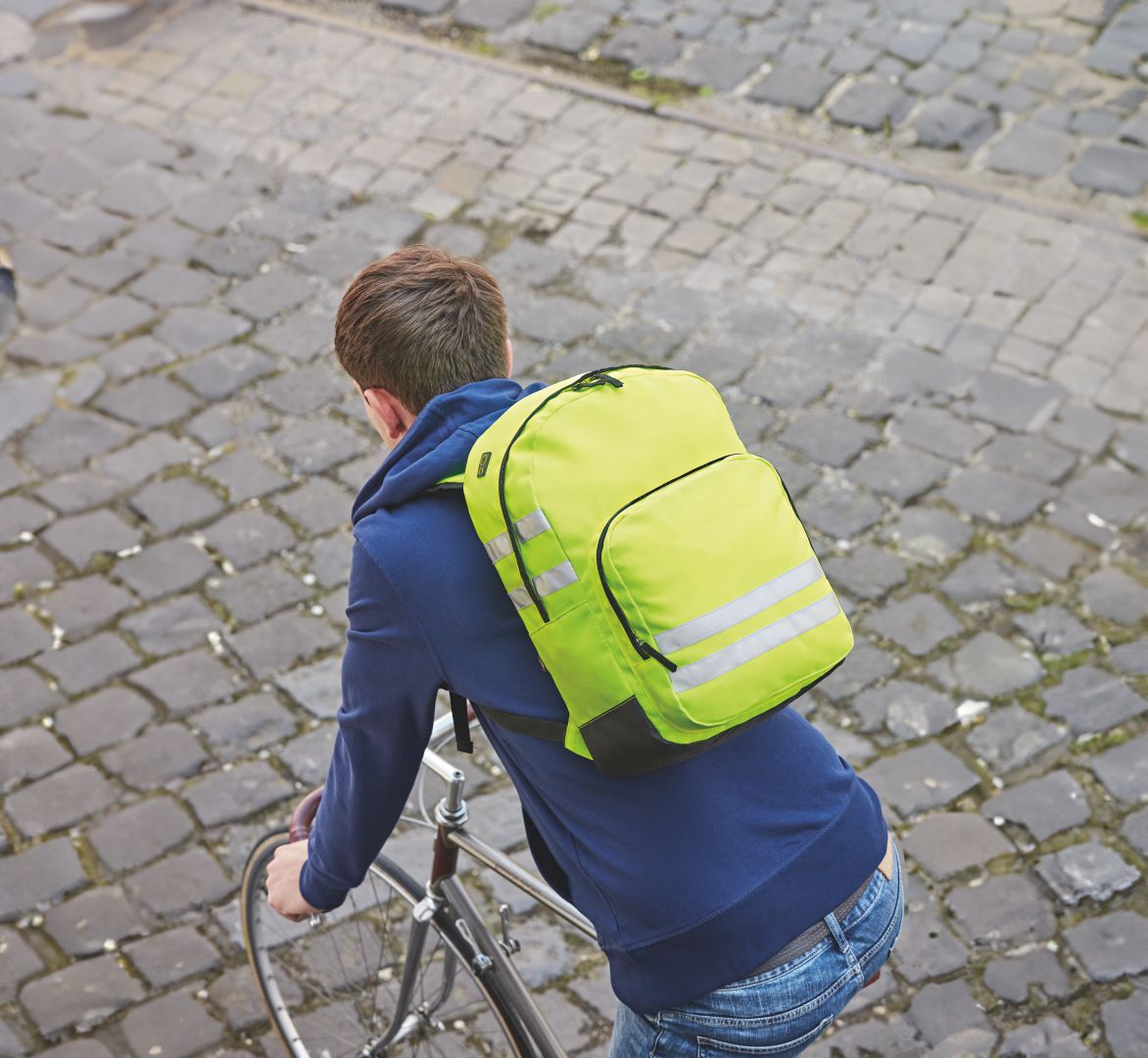 large main compartment with 2-way zipper and rain flap; interior mesh pocket, padded pouch; headphone output; front pocket with 2-way zipper, rain flap and organizer; handle; padded back and shoulder straps; height-adjustable chest strap; bright neon yellow body fabric with 3M™ Scotchlite™ reflective stripes