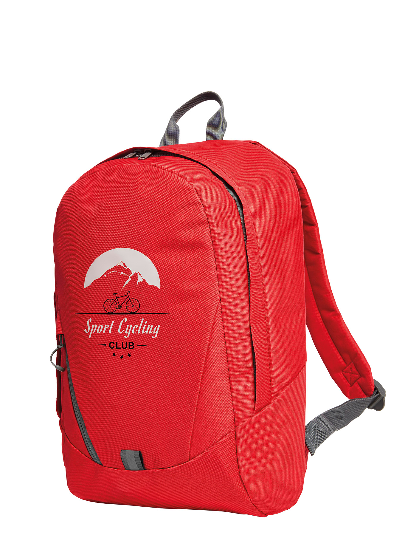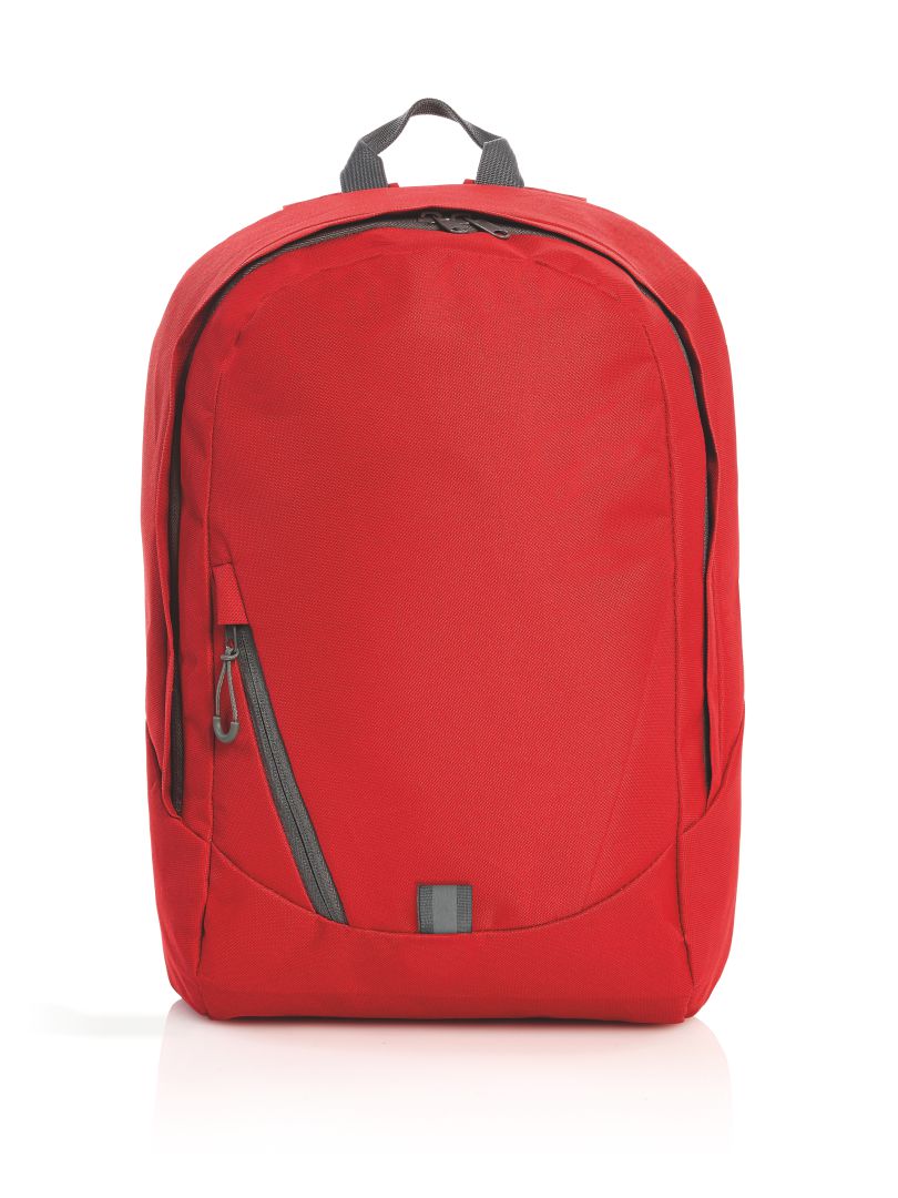 modern backpack with zipper front pocket; main compartment with 2-way zipper and flat inside compartment; rain flap; front reflector stripes, padded back and shoulder straps; handle