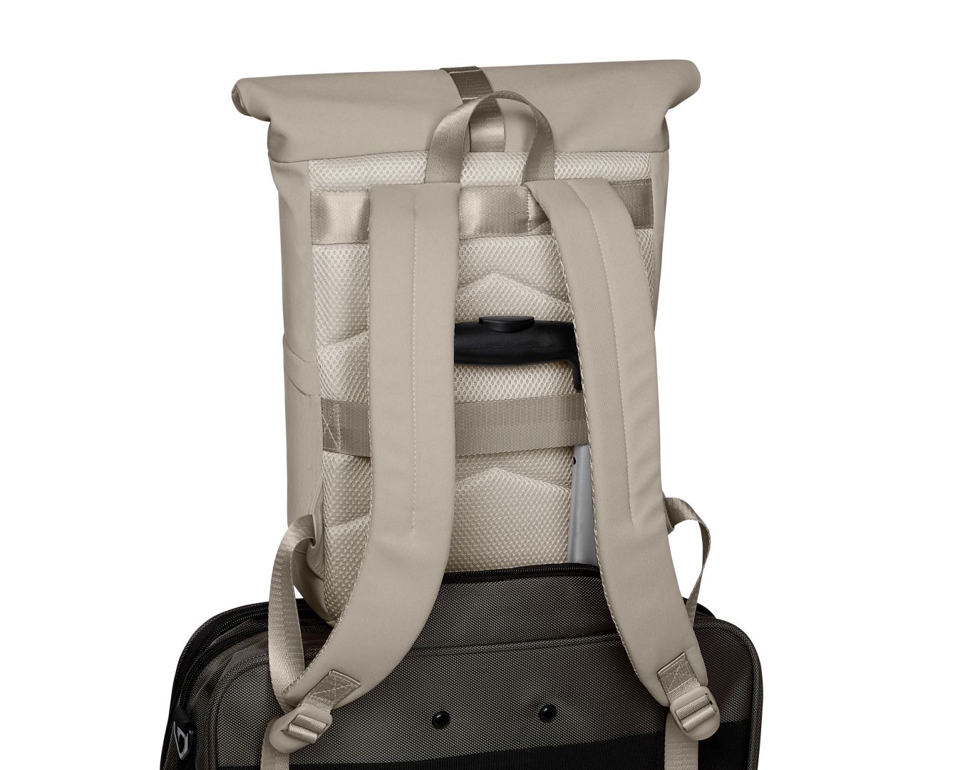 Small is relative. This backpack is only an S version in comparison to its series partner. By itself, it is not really small, but a full quality backpack perfect for many everyday situations. The first thing that makes it a favourite companion is its very pleasant textile material, which feels nice to touch. The tone-on-tone colour design also makes it a feast for the eyes. Everything here simply matches in terms of colour, from zips and straps to the trolley loop and the mesh fabric on the back. Light-coloured contrasting lining only radiates on the inside for better orientation. This is where you will find a padded compartment big enough for small laptops or tablets. And if there are larger items to be transported, the STAR S still has enough capacity at the top. Otherwise, the attractive metal buckle holds everything together to the desired packing size.