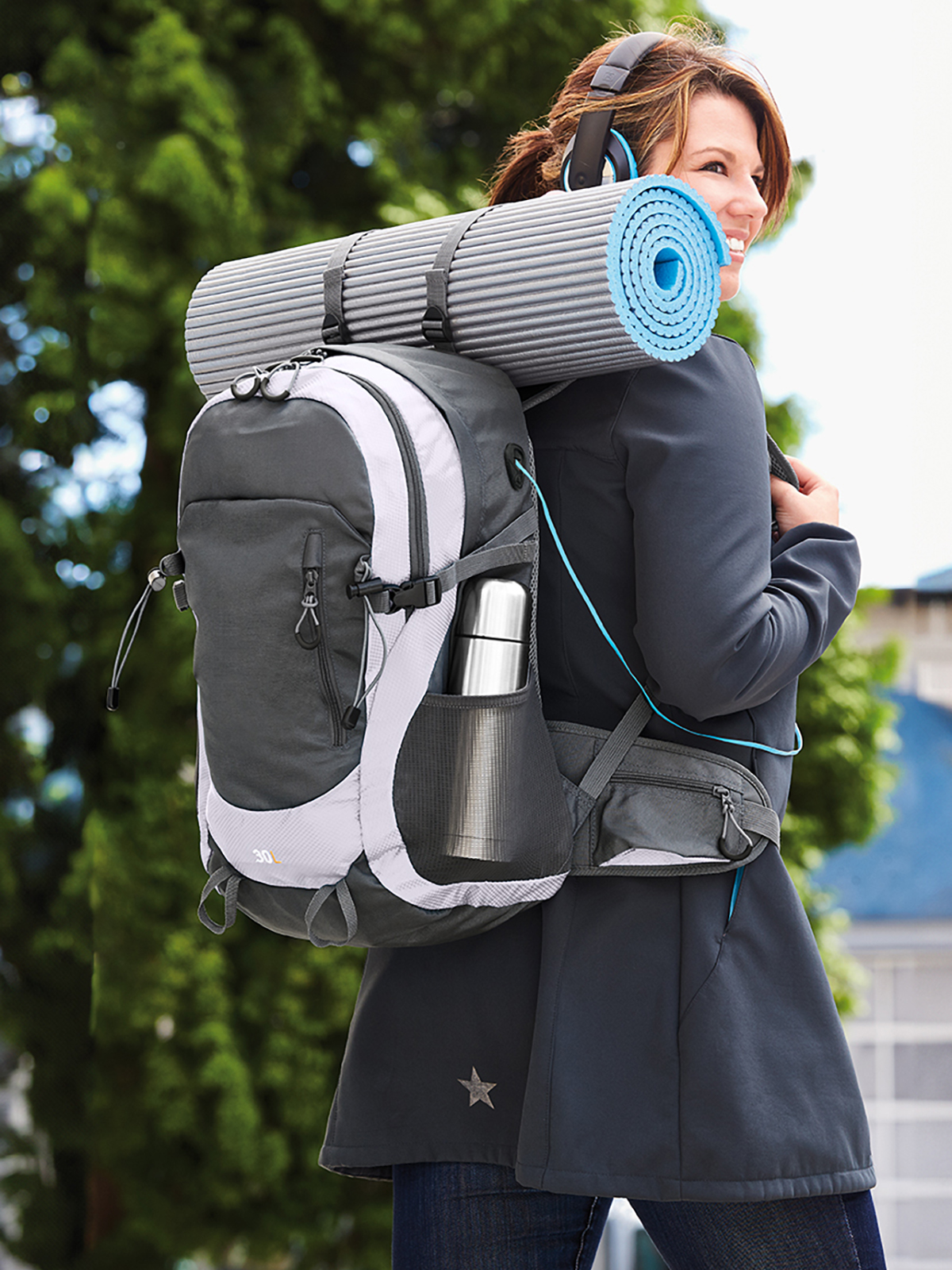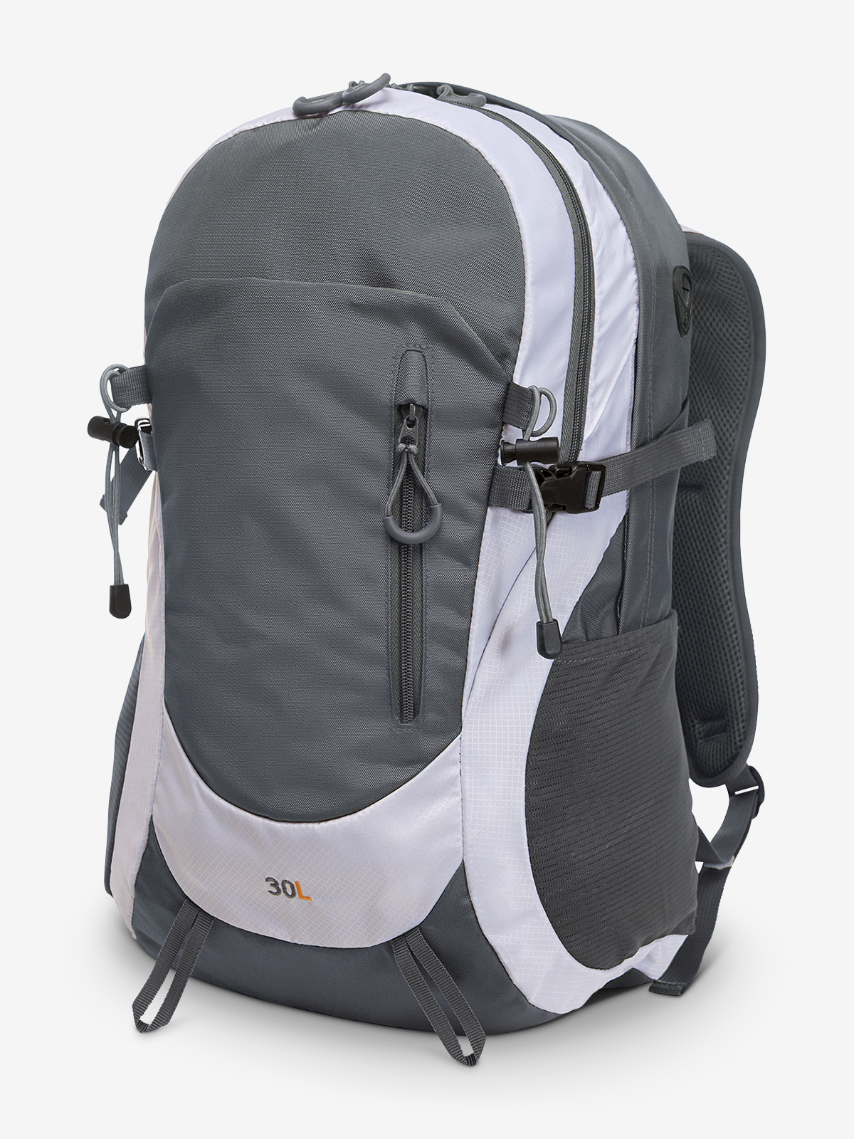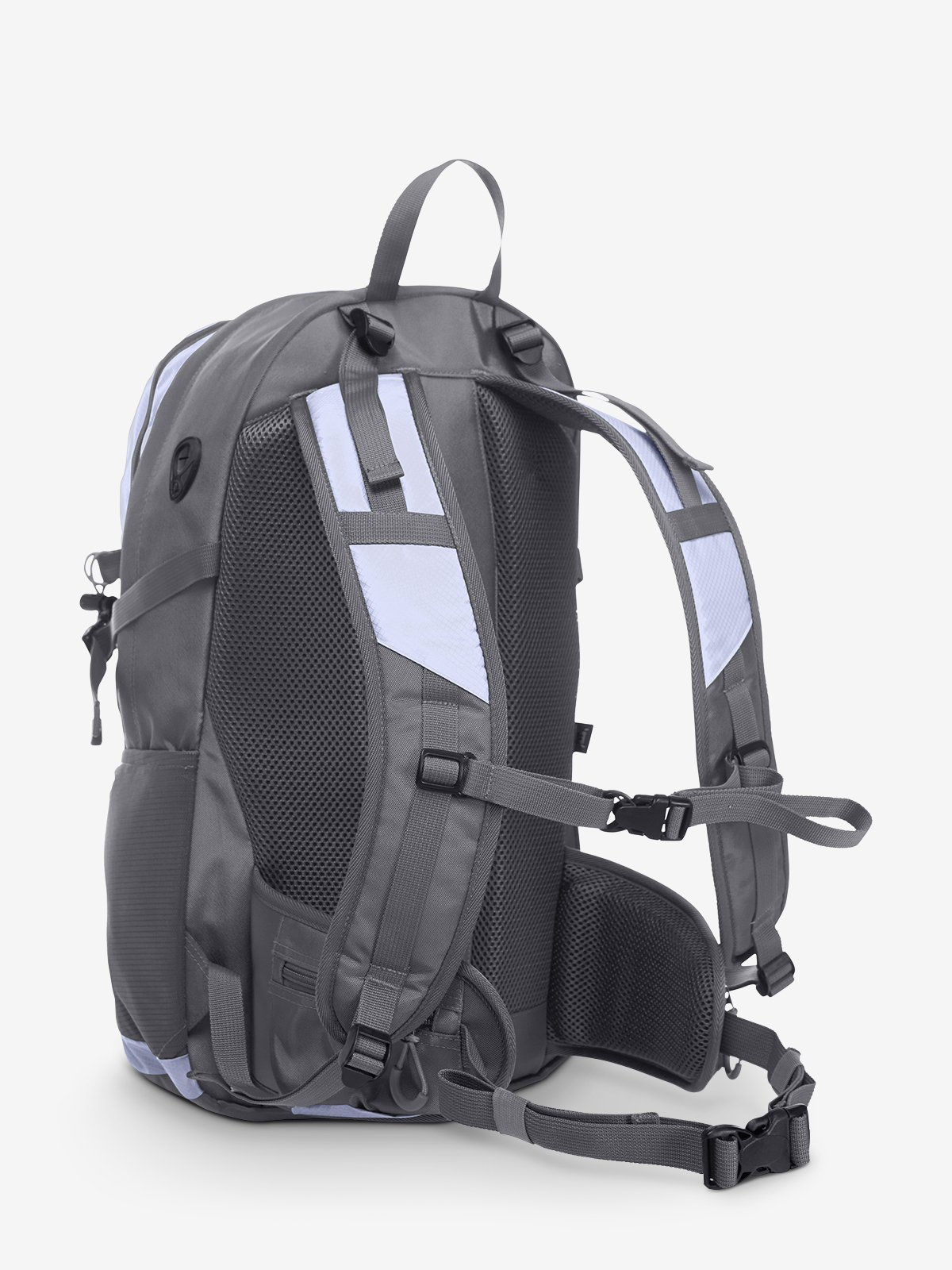 light, functional backpack with optimally padded back; large main compartment with insert pocket and headphone output; 2 outer side pockets; hiking pole fixing; lateral straps; bottom compartment with rain cover; padded shoulder straps with upper and lower length adjustment; padded lap strap with zipper pockets; adjustable chest strap