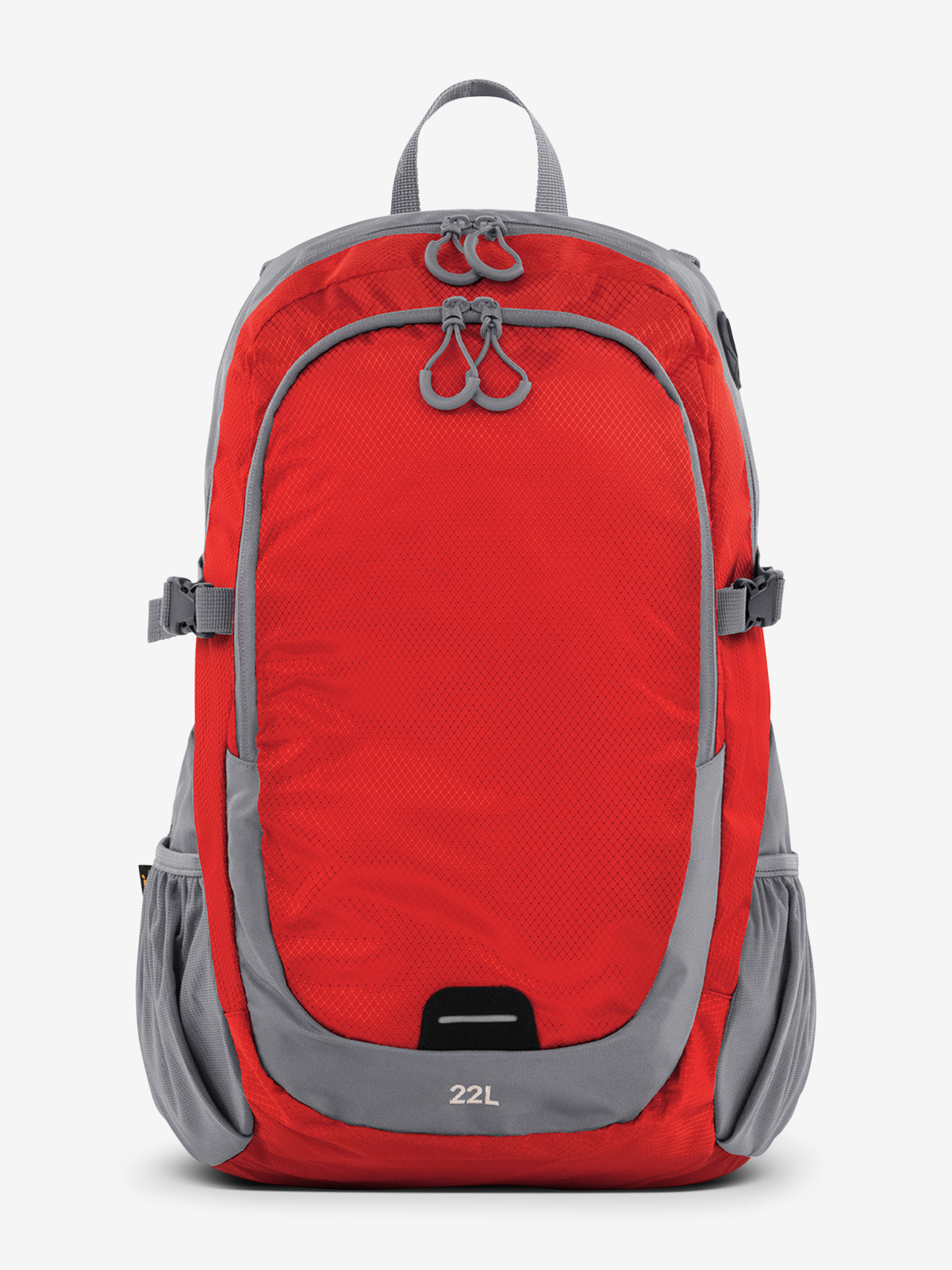 spacious two-way zipper main compartment and insert pocket; lateral lashing strap; zipper front pocket with two insert pouches; reflective strap on the front; lateral mesh pouches; headphone opening; padded shoulder straps with height-adjustable, elastic chest strap; padded back