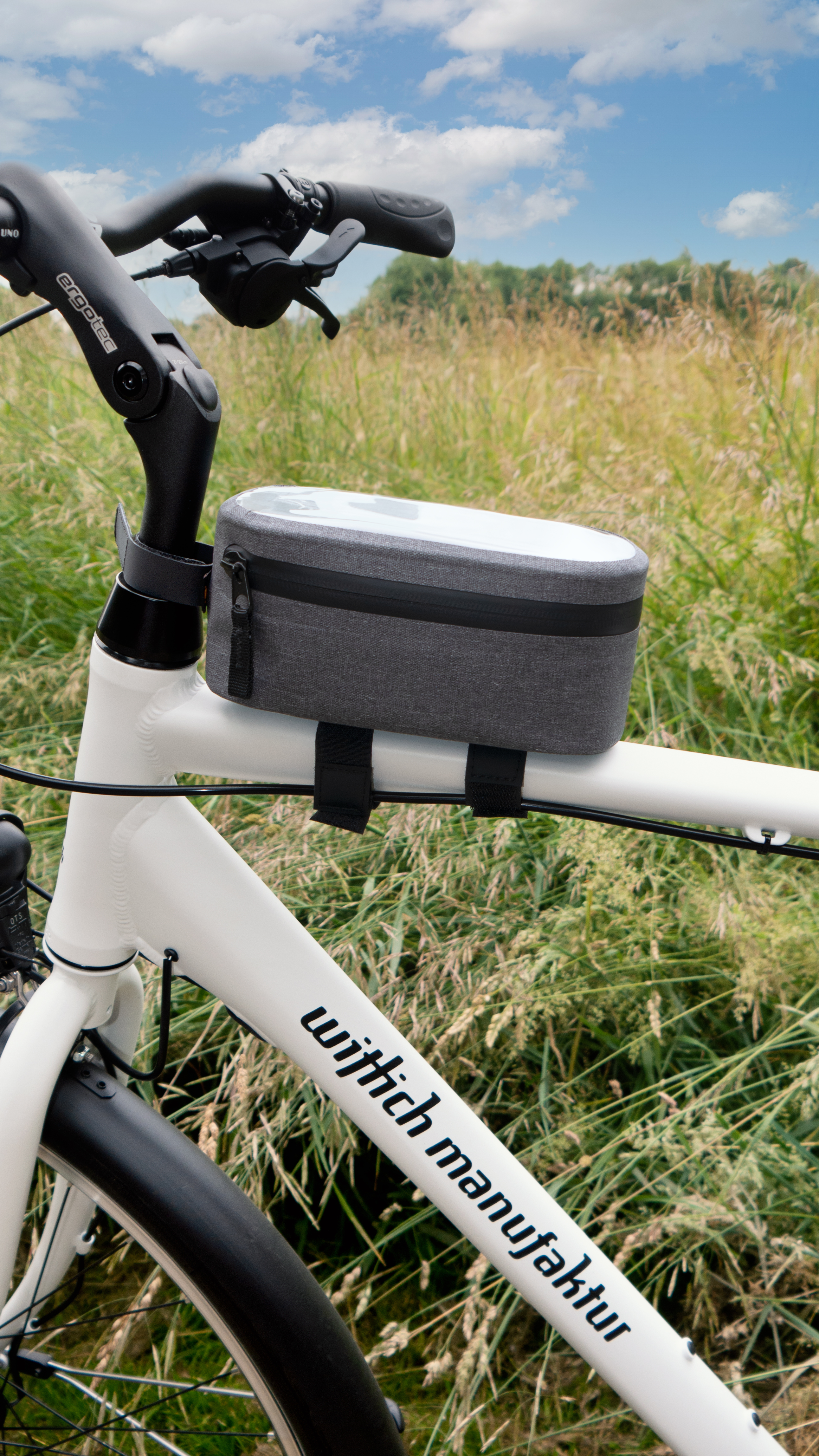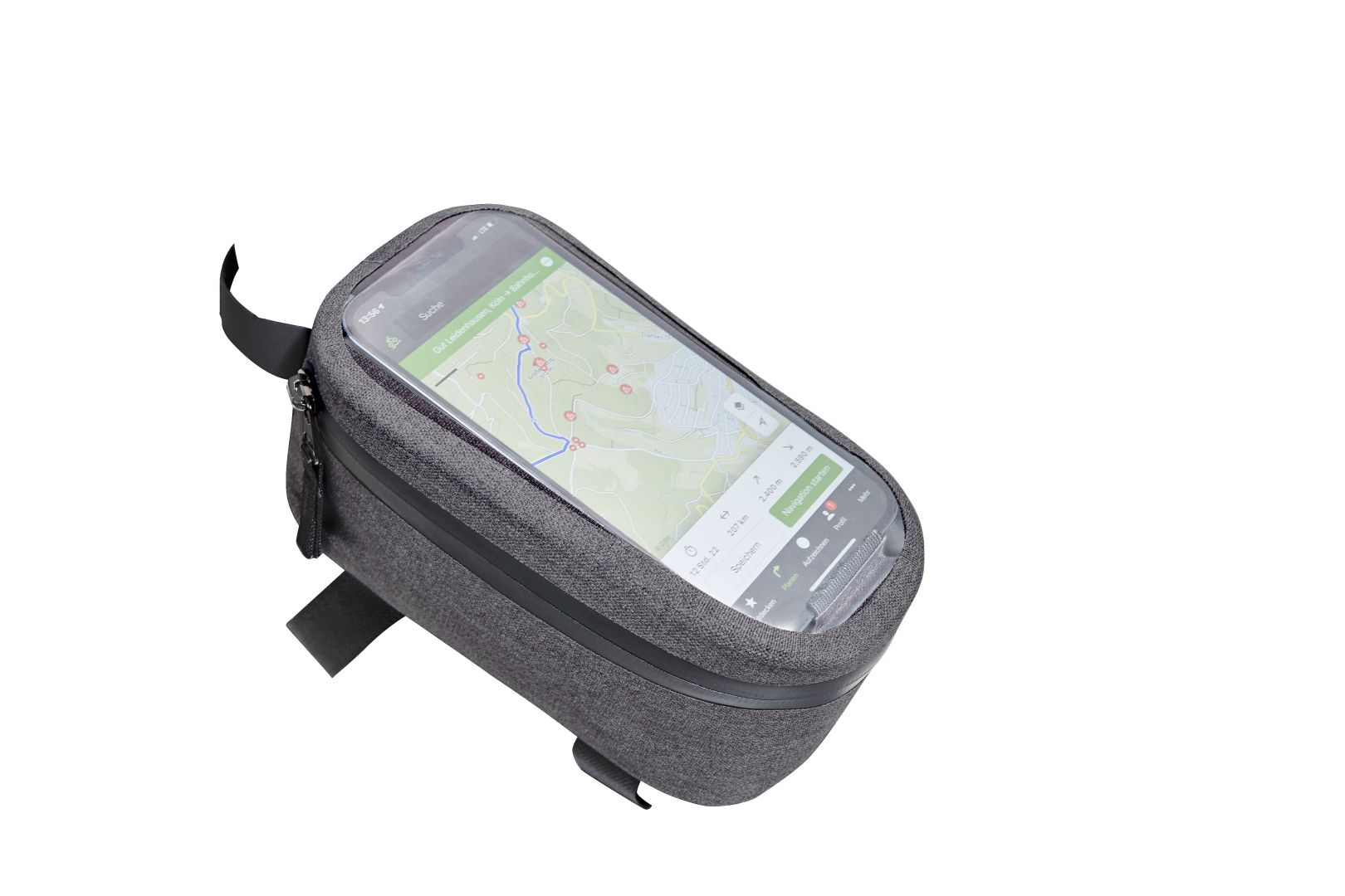 In a car, there’s the dashboard and on-board computer – on a bike there’s now the CYCLE bike frame bag. With the variably adjustable mobile phone pouch with transparent window, it becomes a control centre for bike rides short or long, whether heading out into the countryside or commuting into the office. So you’ve literally got it: with the CYCLE on your frame, you can navigate or listen to music as your pedal. The mobile phone display can be operated directed via the transparent window. Your phone is well protected if it rains, as are the contents of the zippered bag beneath it, thanks to welded seams and other features. The Velcro system allows it to be mounted on any frame. Plus, the bag contents cope well with bumpy roads: the bottom of the bag comes with added padding.
