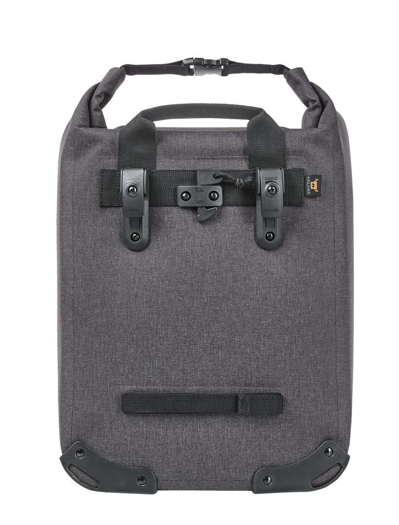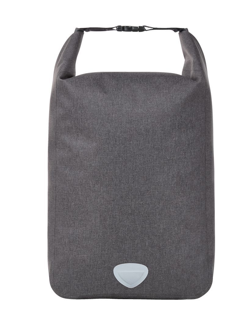 urban bike bag with spacious main compartment; large, inner pocket with zip; roll-top closure; welded seams for reliable protection against rainwater and moisture; bottom and edge protection; individually-adjustable bracket for luggage rack attachment with twist lock, for security and Velcro closure on the bottom back part of the bag for additional fixation; decorative reflector application; hand grip