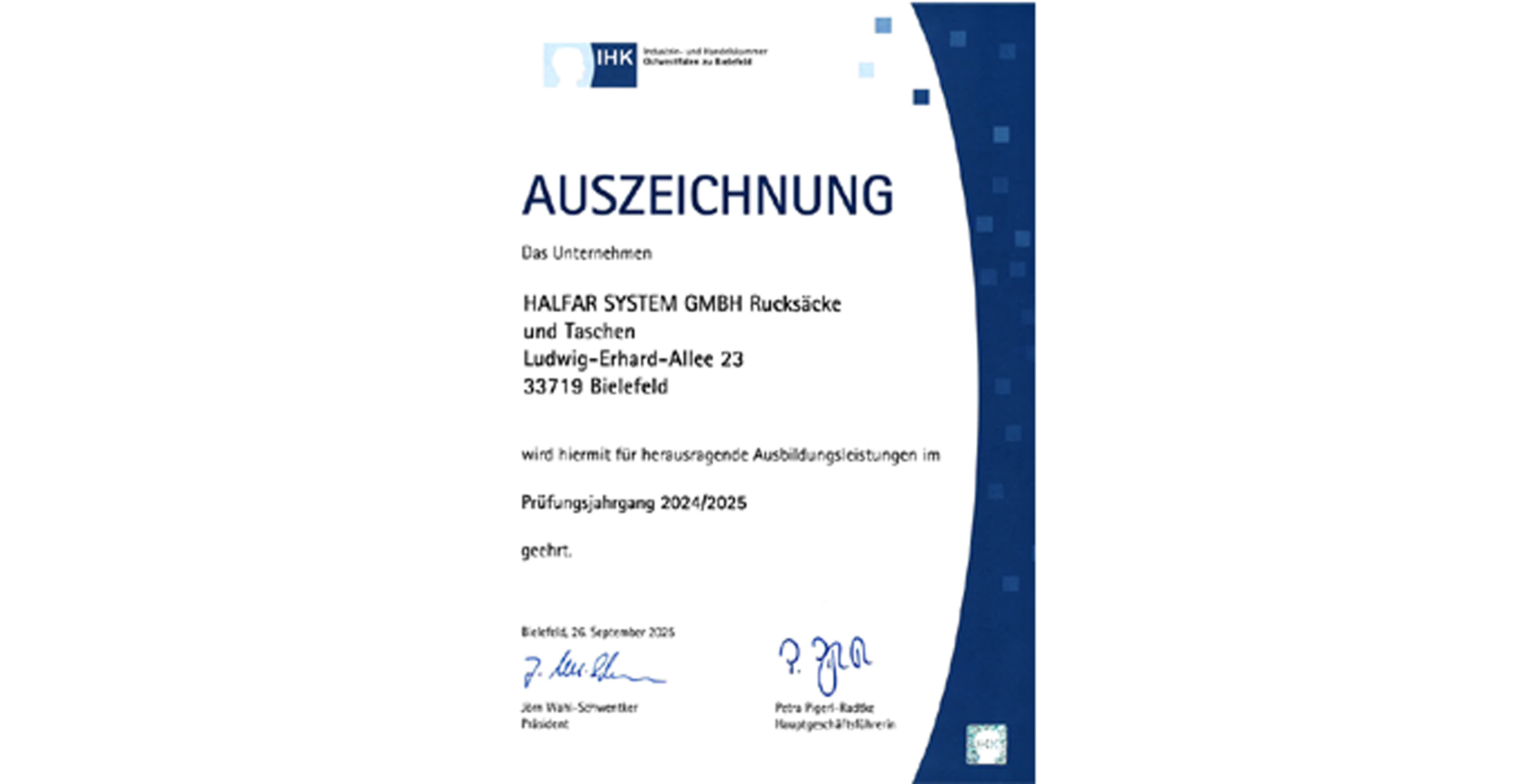 Since September 2025, Halfar has been proud to hold the IHK seal of approval for outstanding training achievements. This award was presented to us by the East Westphalia Chamber of Industry and Commerce in Bielefeld and confirms the high quality and commitment we invest in training our junior staff.