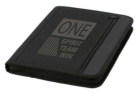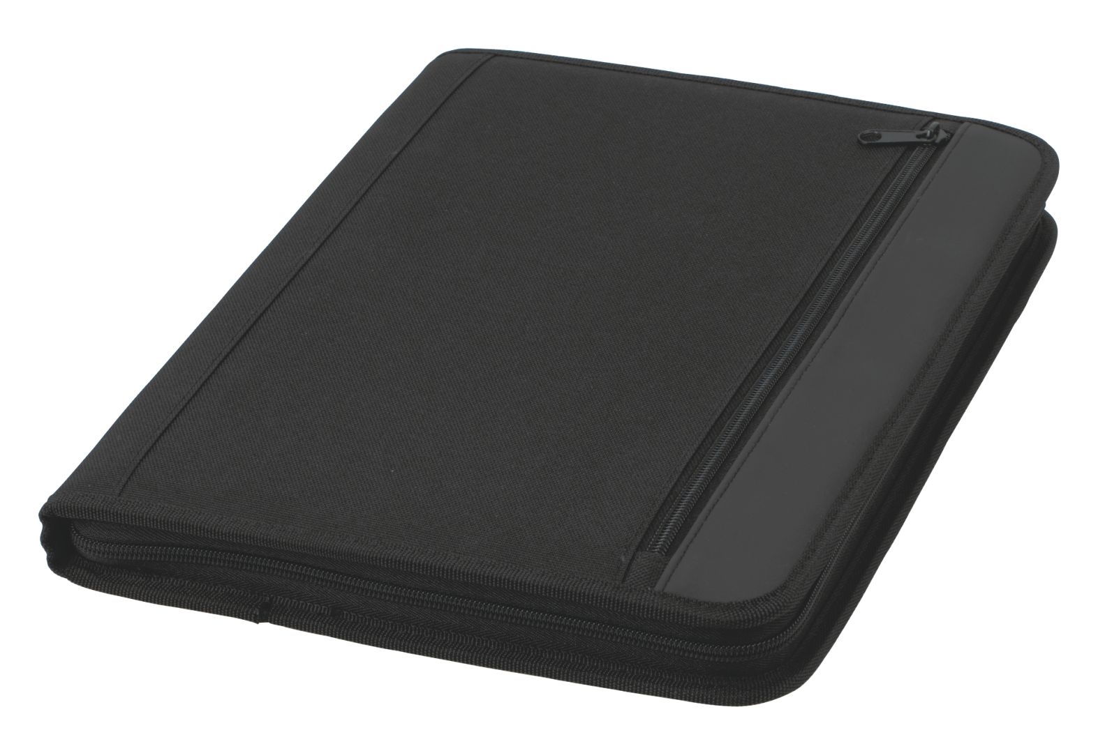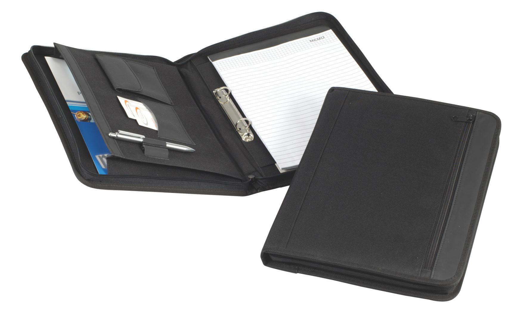 zipper conference folder with organizer features; writing pad and 2 ring binder; flat pocket; zipper pocket