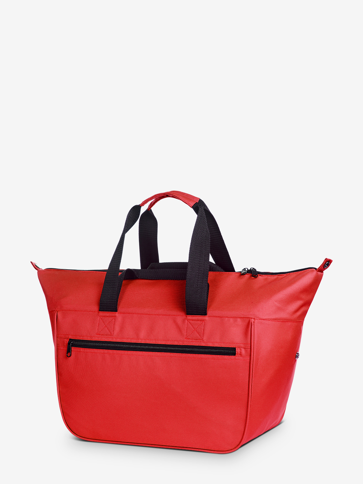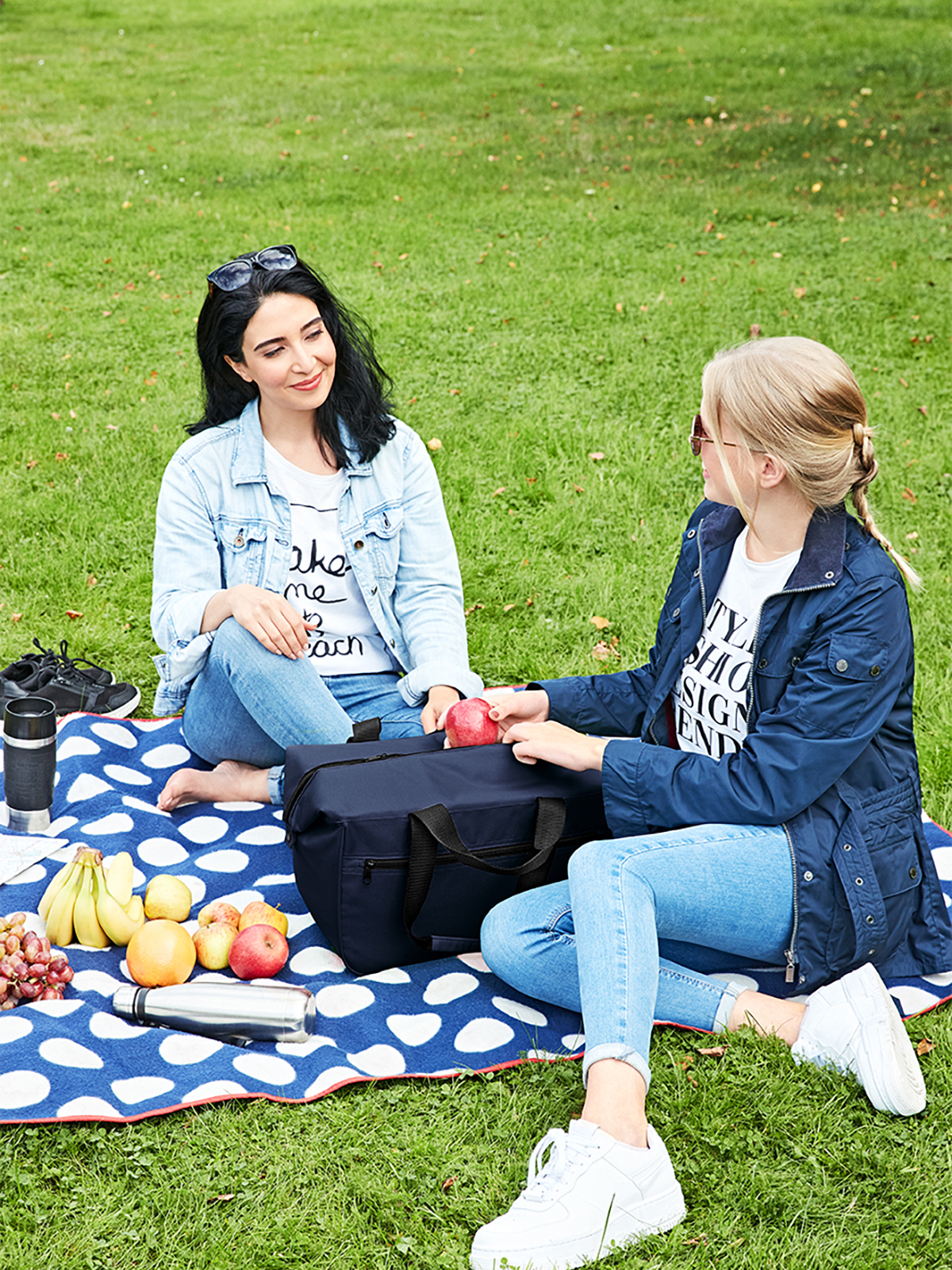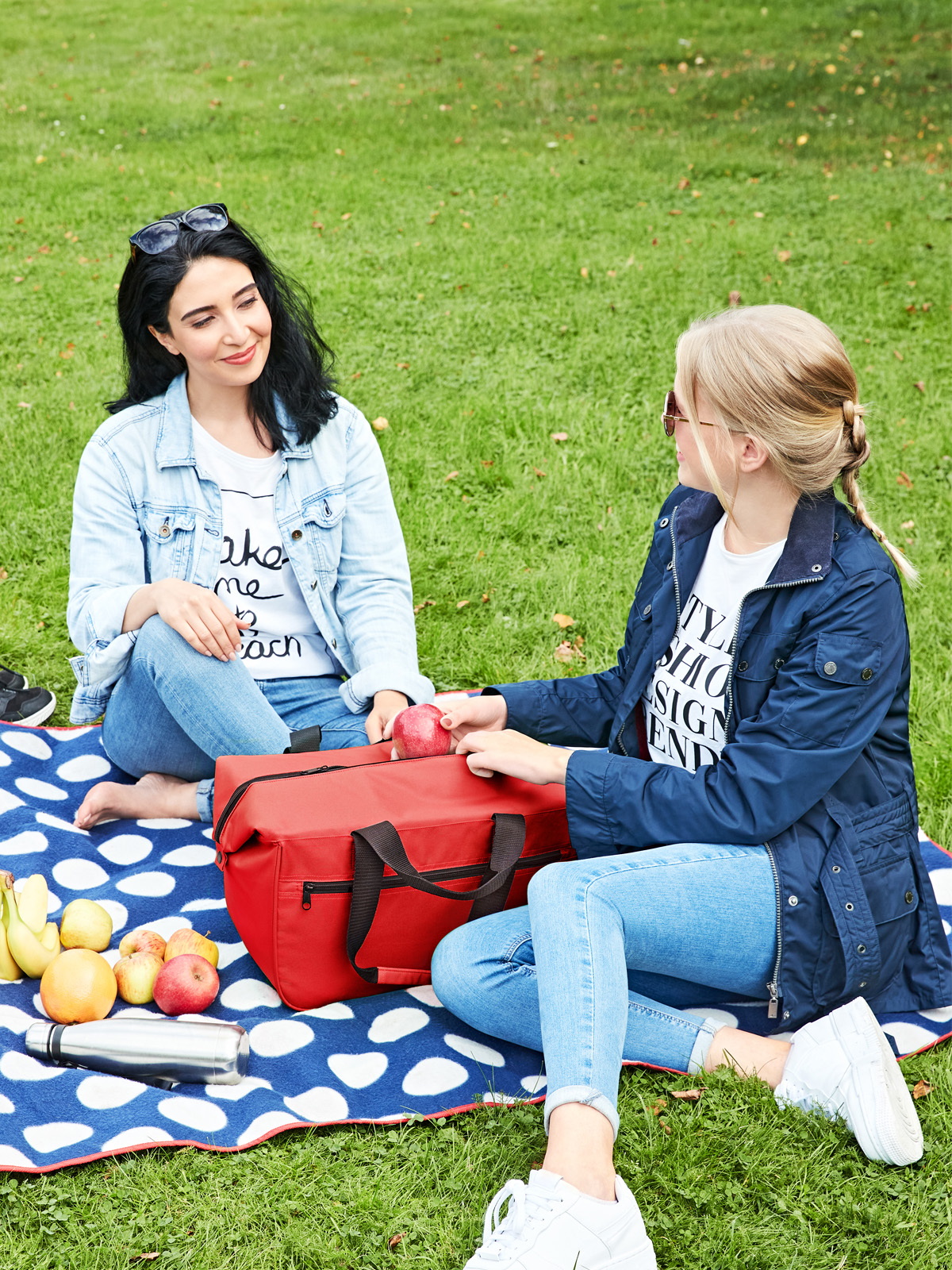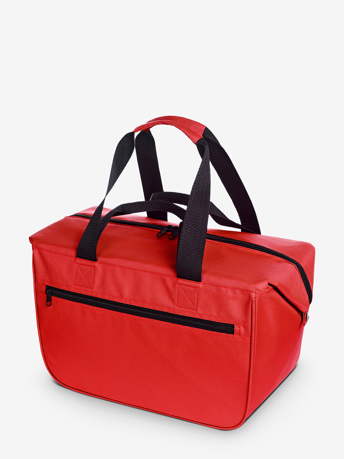 Innovative flexible cooler basket; large 2-way zipped main compartment; volume can be increased via side press stud flaps; zipped front pocket; washable inside; carrying system with double handles and padded handle cuff for best carrying comfort; folds up