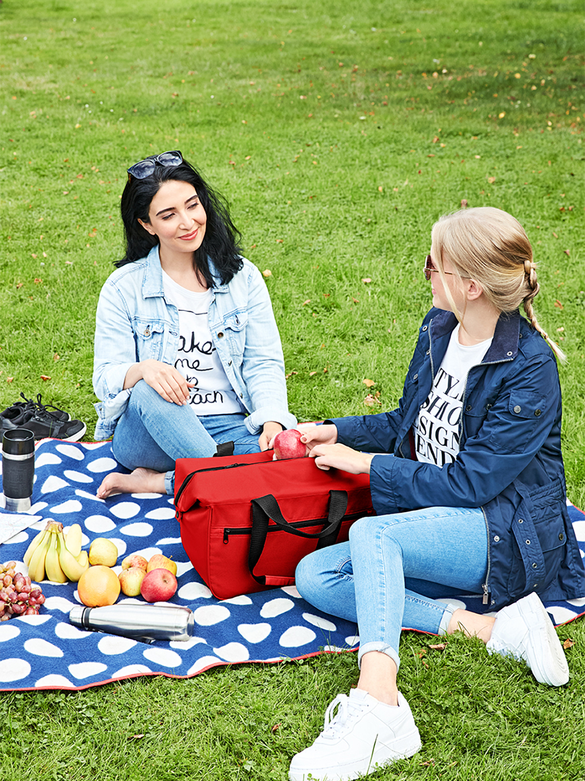 Innovative flexible cooler basket; large 2-way zipped main compartment; volume can be increased via side press stud flaps; zipped front pocket; washable inside; carrying system with double handles and padded handle cuff for best carrying comfort; folds up