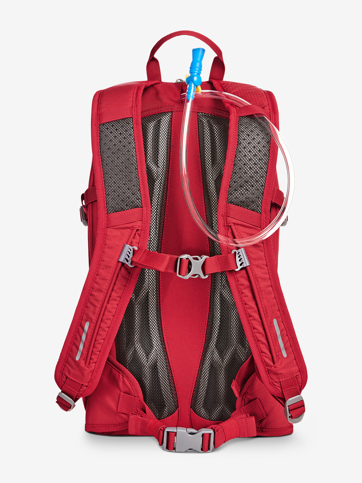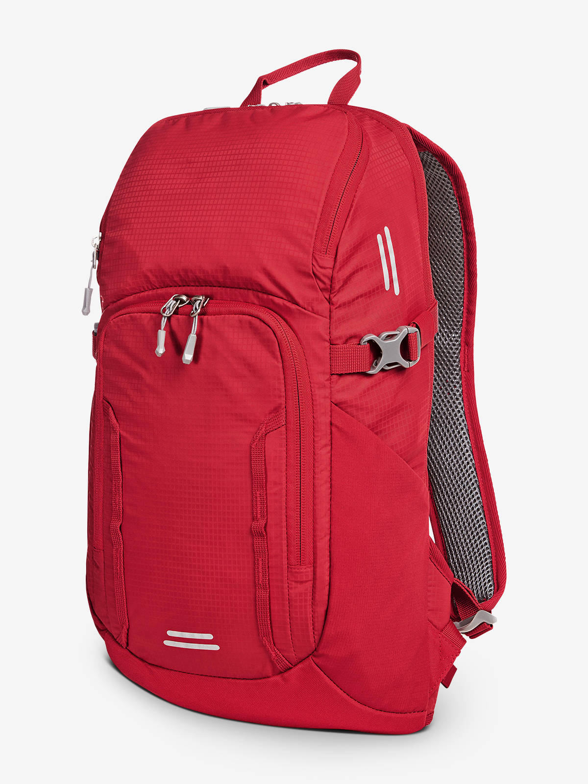 Lightweight, functional day and bike backpack with innovative honeycomb back system for ideal ventilation and padding; height-adjustable chest strap; padded pelvic strap on the side; large 2-way zipped main compartment with flat slip-in pocket inside; rear port suitable for headphones or tube of the optional hydration system (item 1812216); hook-and-loop strap for fixing the hydration tube; 2 zipped front pockets; 2 mesh side pockets; side lashing straps; functional strap band on the front pocket; decorative reflective print, hand grip