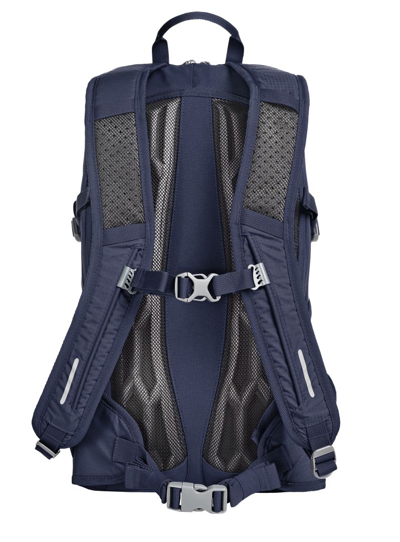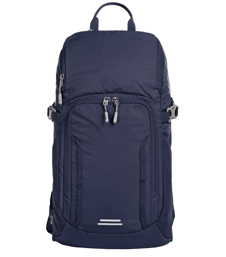 Lightweight, functional day and bike backpack with innovative honeycomb back system for ideal ventilation and padding; height-adjustable chest strap; padded pelvic strap on the side; large 2-way zipped main compartment with flat slip-in pocket inside; rear port suitable for headphones or tube of the optional hydration system (item 1812216); hook-and-loop strap for fixing the hydration tube; 2 zipped front pockets; 2 mesh side pockets; side lashing straps; functional strap band on the front pocket; decorative reflective print, hand grip