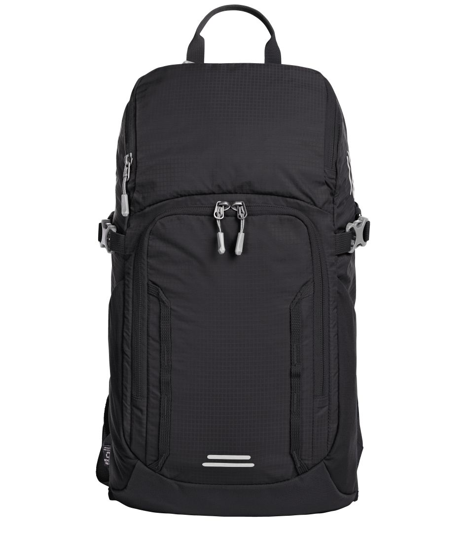 Lightweight, functional day and bike backpack with innovative honeycomb back system for ideal ventilation and padding; height-adjustable chest strap; padded pelvic strap on the side; large 2-way zipped main compartment with flat slip-in pocket inside; rear port suitable for headphones or tube of the optional hydration system (item 1812216); hook-and-loop strap for fixing the hydration tube; 2 zipped front pockets; 2 mesh side pockets; side lashing straps; functional strap band on the front pocket; decorative reflective print, hand grip