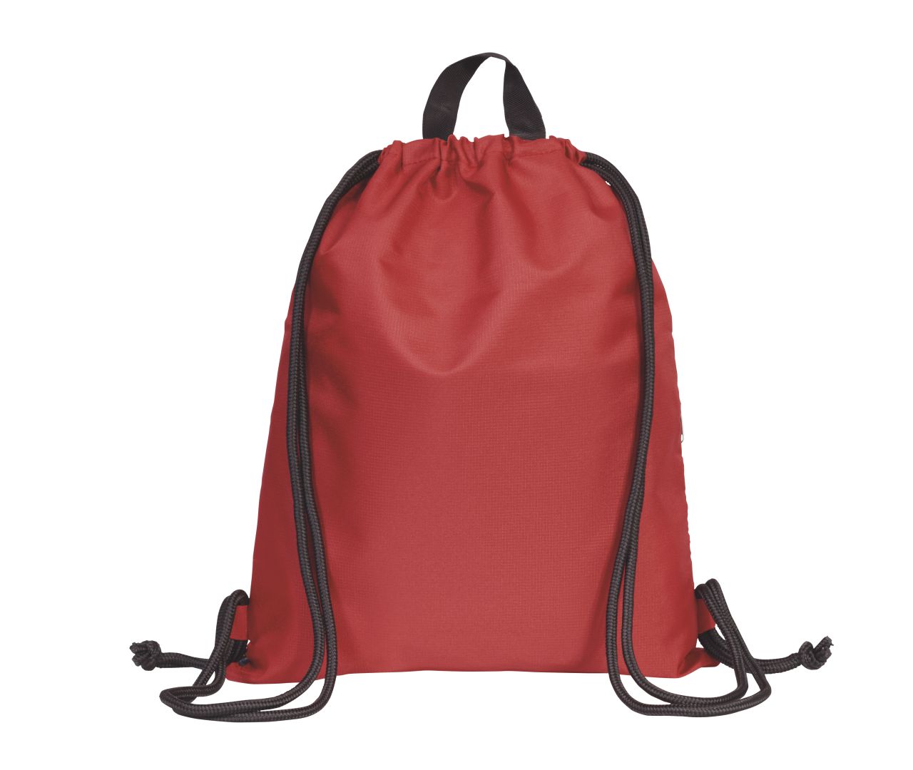 large drawstring backpack; main compartment with lateral zipper pocket; drawstring; carrying loop