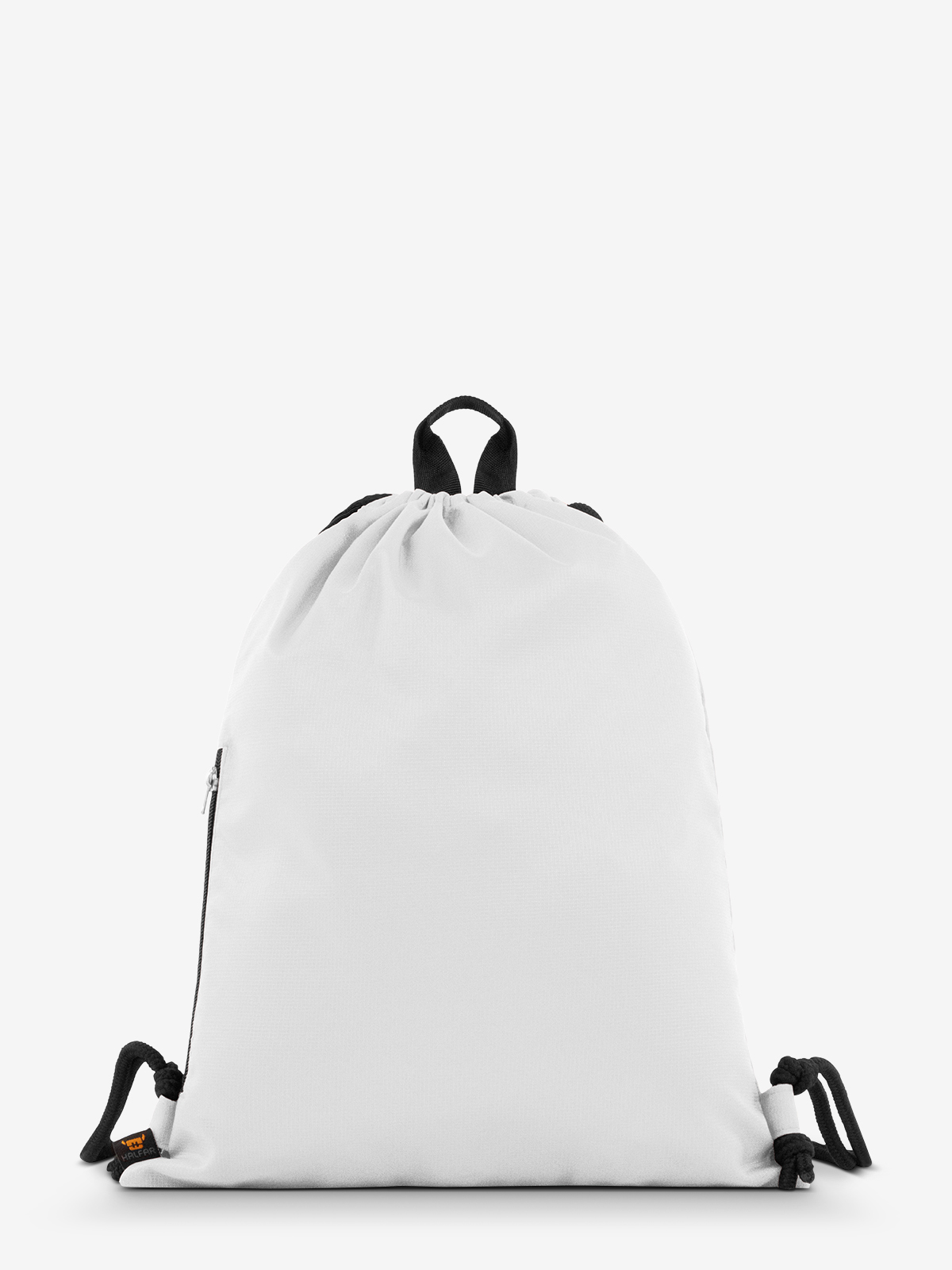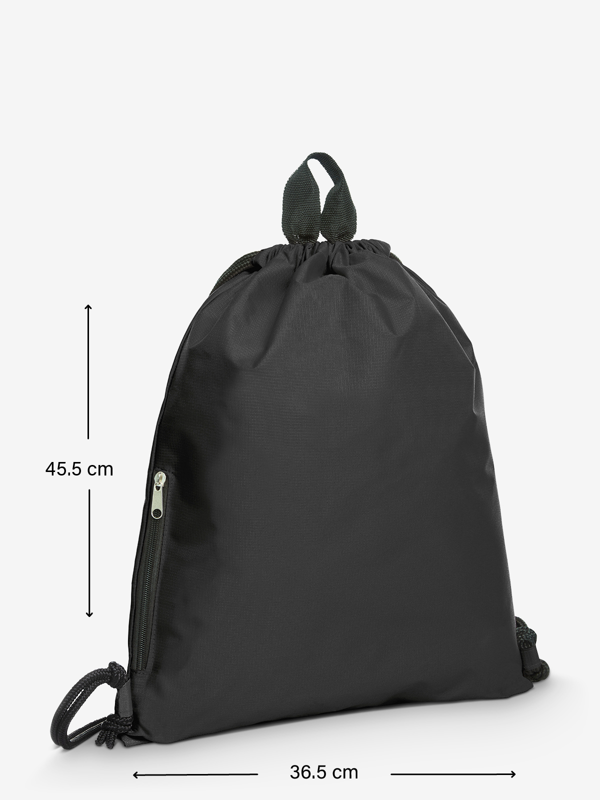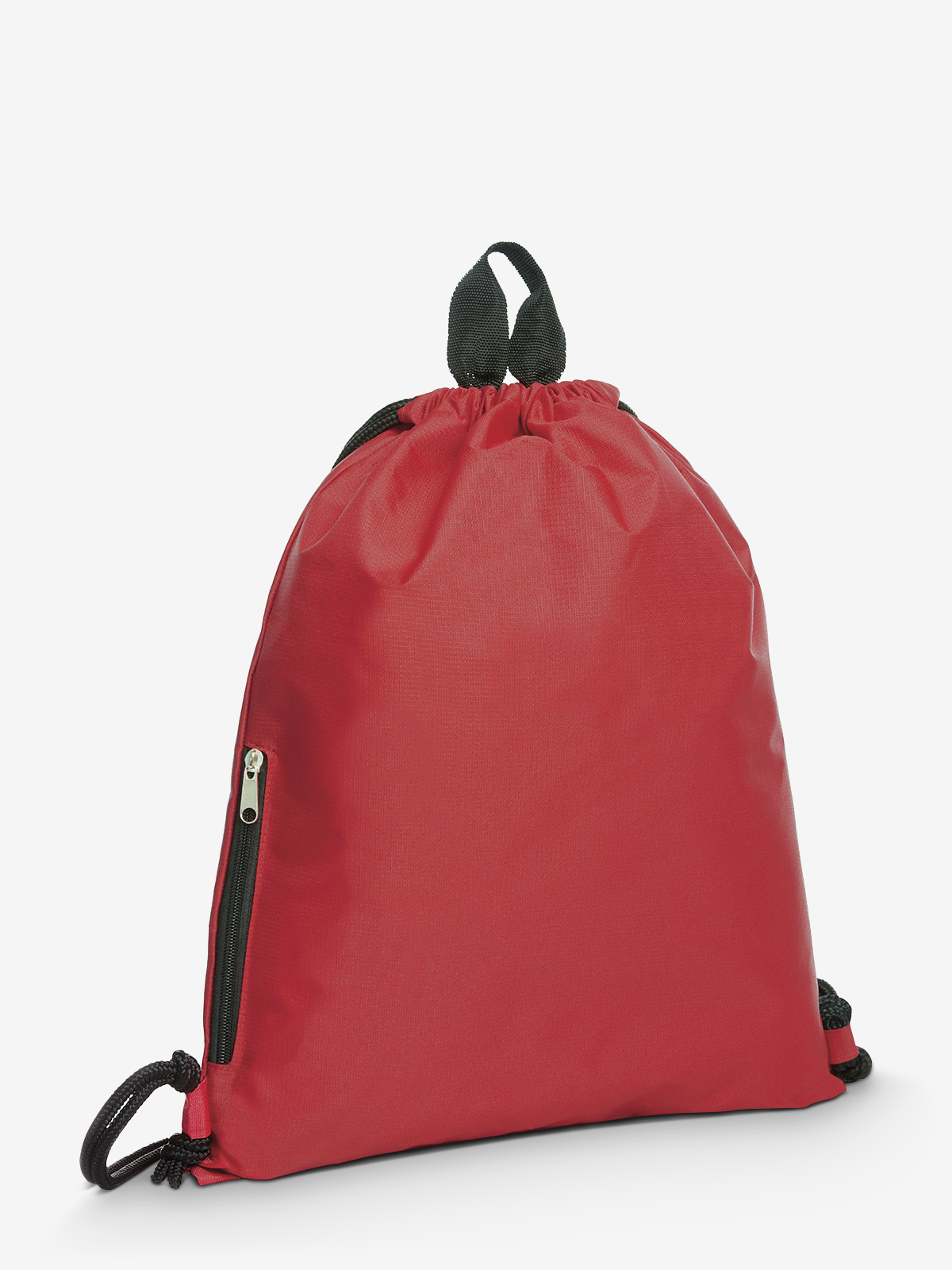 large drawstring backpack; main compartment with lateral zipper pocket; drawstring; carrying loop