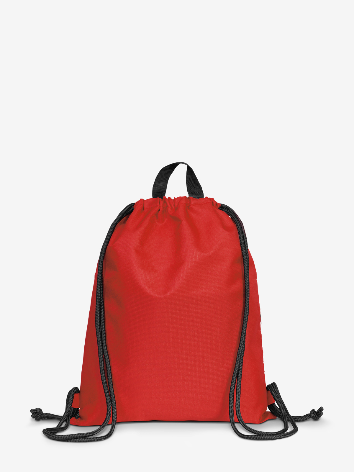 large drawstring backpack; main compartment with lateral zipper pocket; drawstring; carrying loop