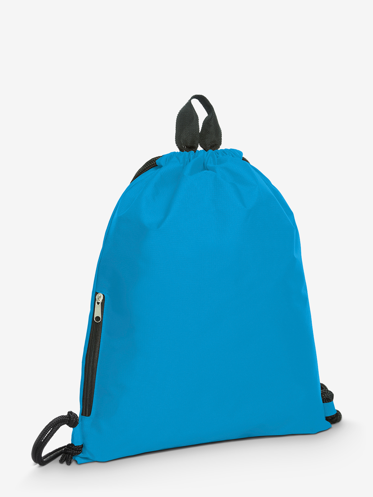 large drawstring backpack; main compartment with lateral zipper pocket; drawstring; carrying loop