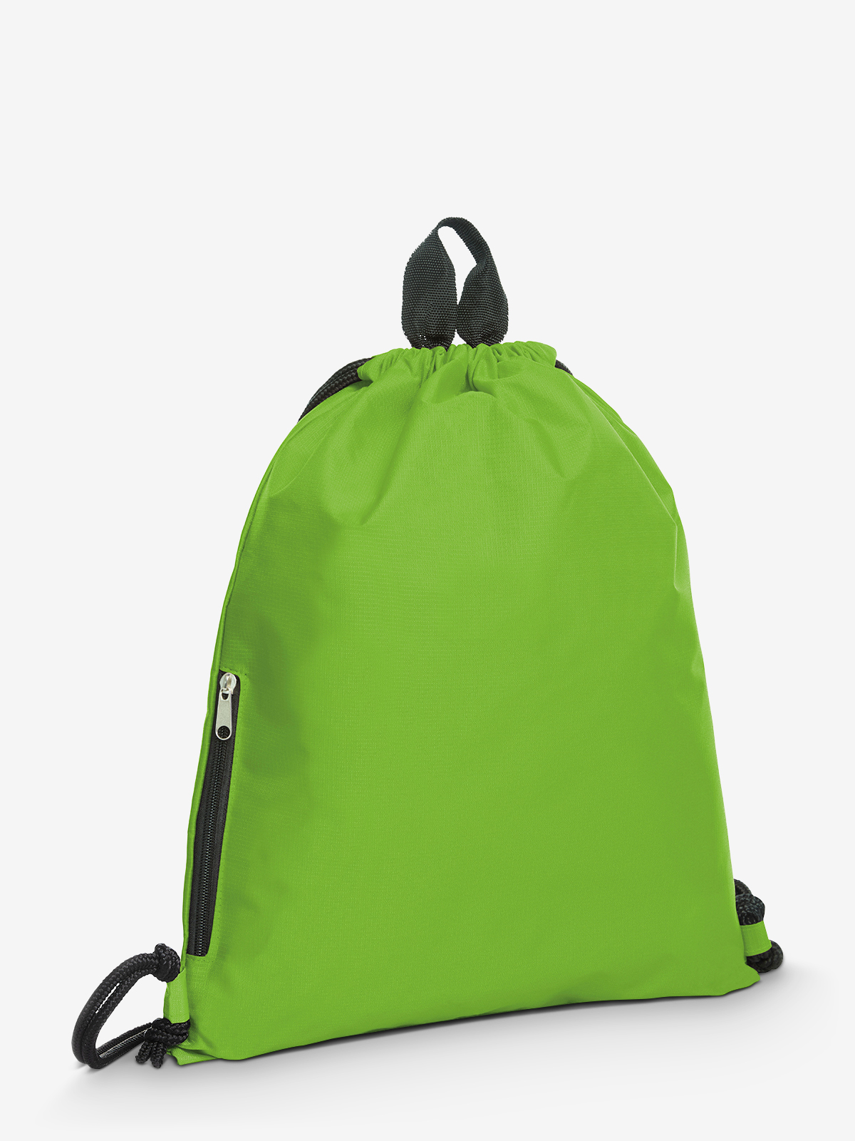 large drawstring backpack; main compartment with lateral zipper pocket; drawstring; carrying loop