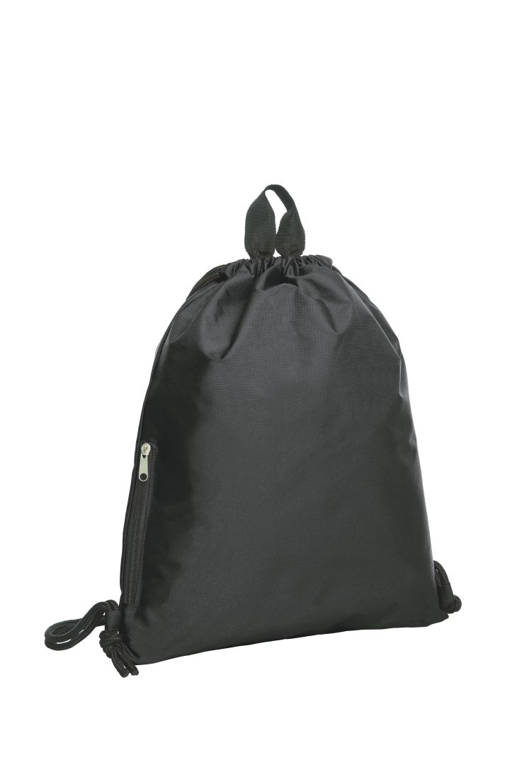 large drawstring backpack; main compartment with lateral zipper pocket; drawstring; carrying loop
