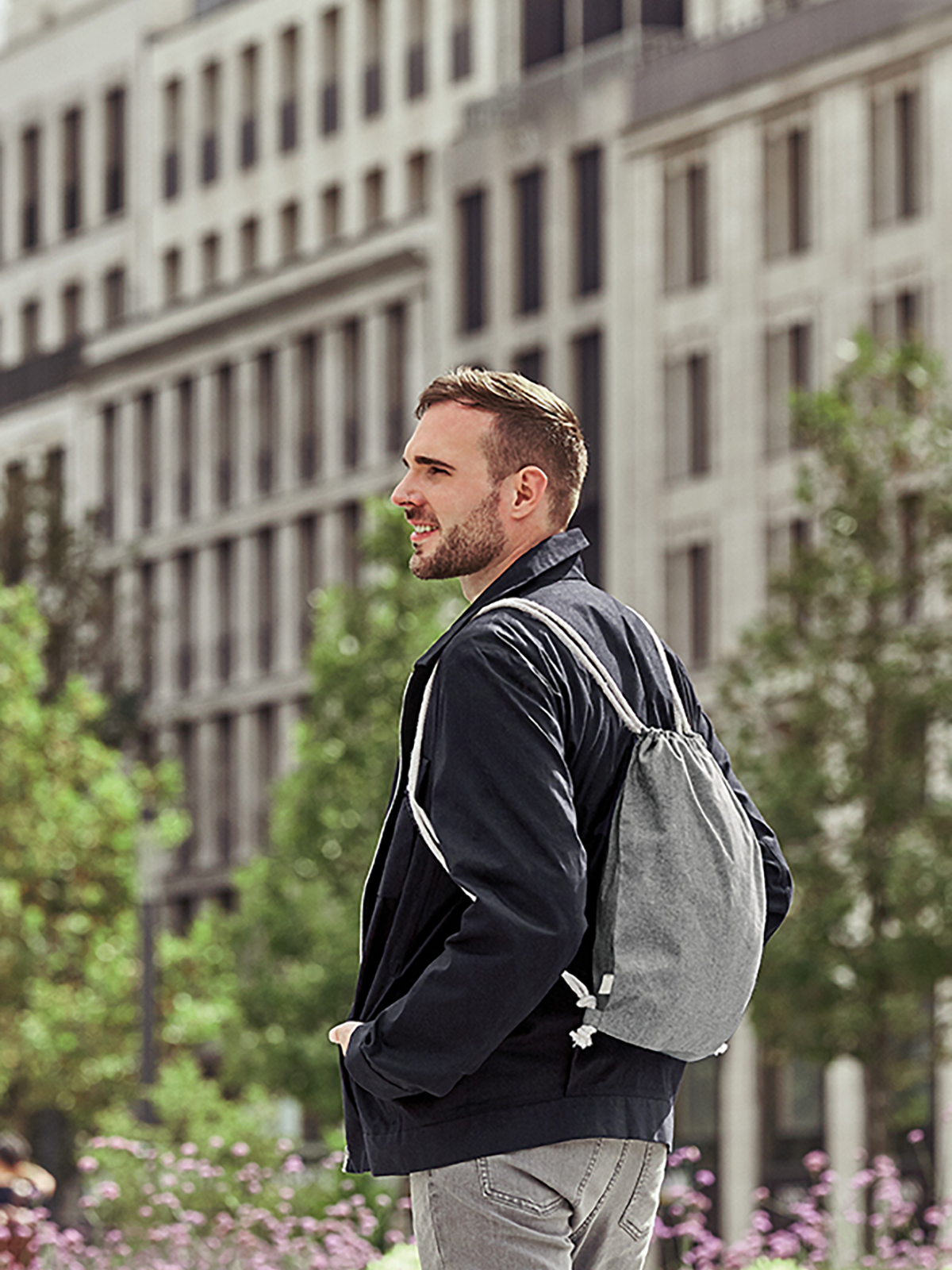 In truth, you can only tell by the sewn-in label: this drawstring bag is a recycling product. Its body was made from pre-recycled cotton. In practical terms, this means from reworked offcut remnants from bag production. So give this second life its own meaning: customise the drawstring bag with your logo and put it back into circulation as promotional bag or bonus gift. As a truly universal talent, it gives sustainable joy!