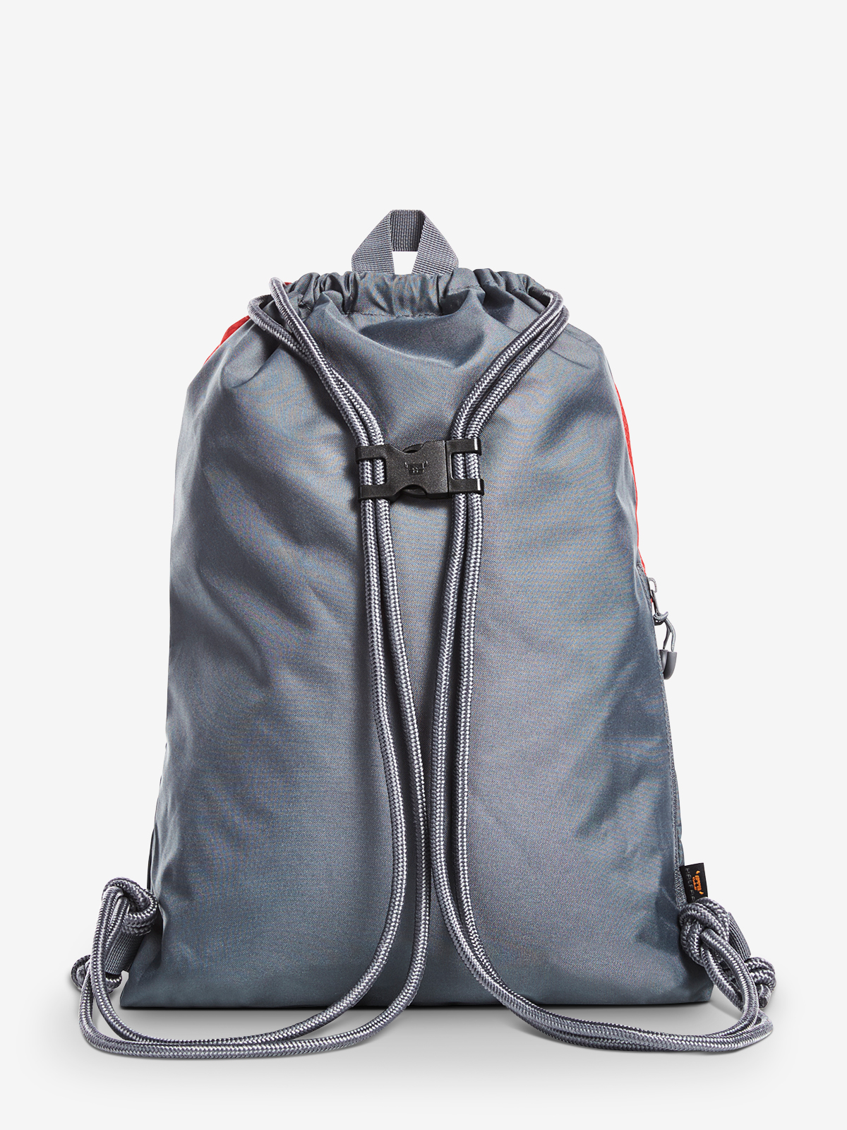 large drawstring bag; main compartment with side zipper pocket; reflector stripes; pull cord; carry loop