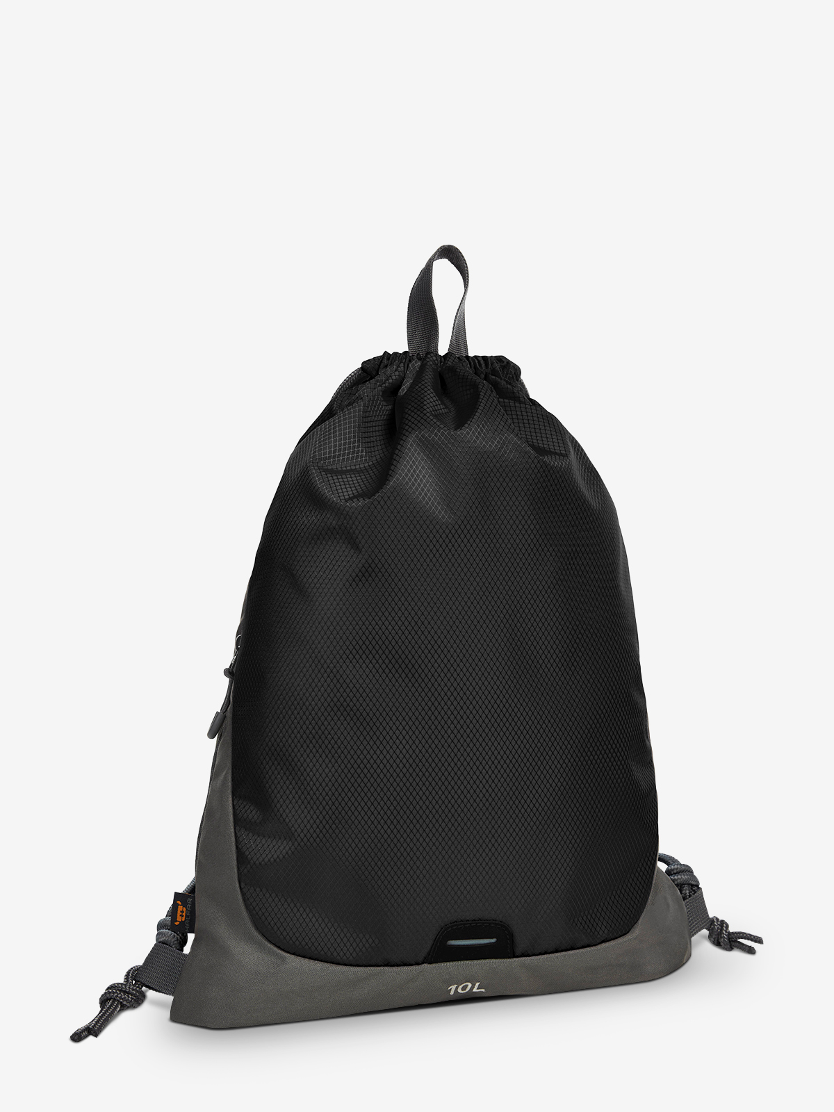 large drawstring bag; main compartment with side zipper pocket; reflector stripes; pull cord; carry loop