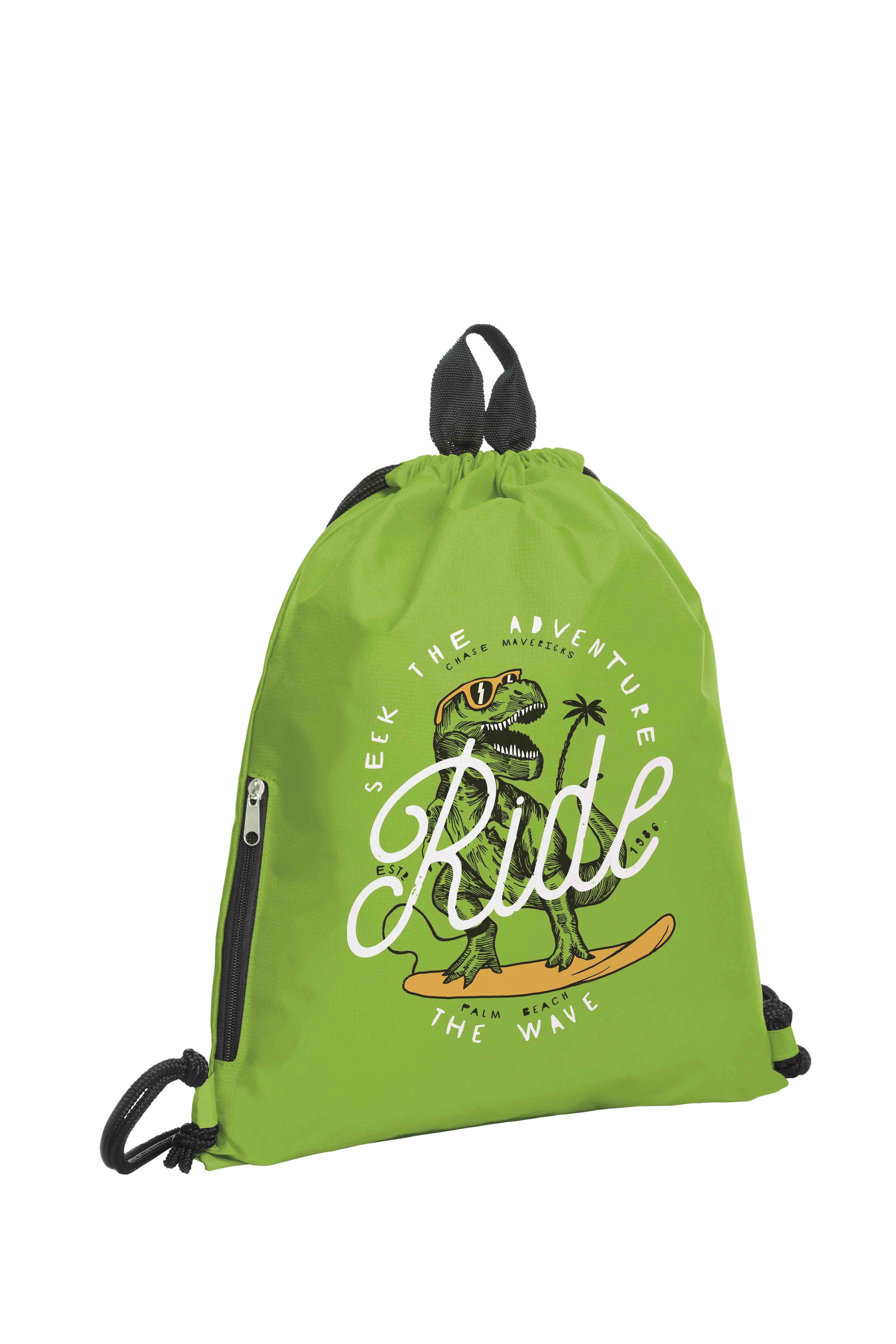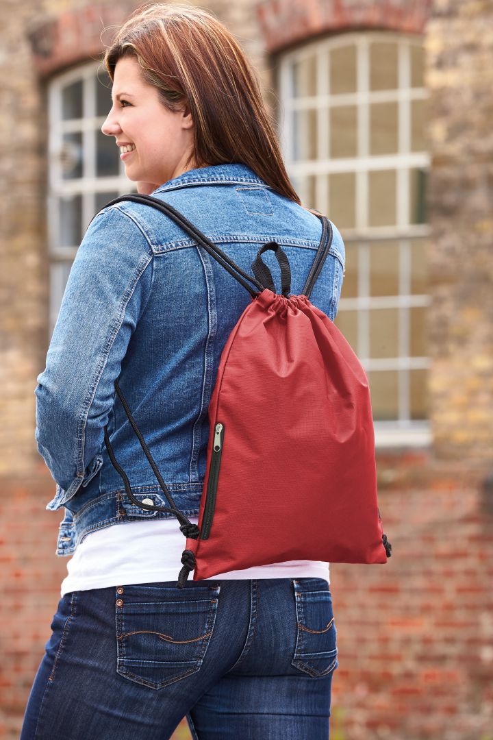 large drawstring backpack; main compartment with lateral zipper pocket; drawstring; carrying loop
