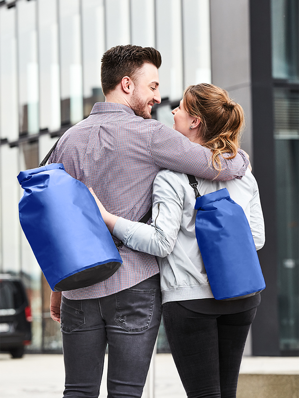 Or to put it even better: If you are already standing in the rain at least everything will stay dry. Whether in a light drizzle or strong showers: this soft tarpaulin bag is in its element in wet weather. Water-resistant, with welded seams and equipped with a smart roll closure: this bag is the recommended tip for adventure seekers. Hip promotional media for travel, outdoors, youth or city marketing. Also available in a larger size with #1809787.