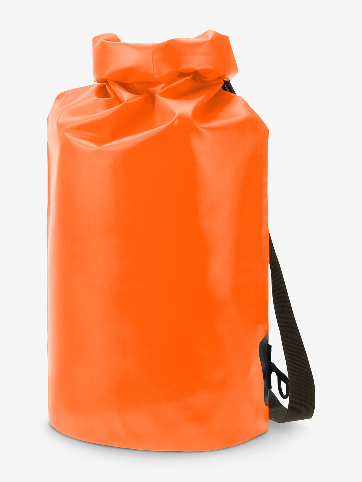 Or to put it even better: If you are already standing in the rain at least everything will stay dry. Whether in a light drizzle or strong showers: this soft tarpaulin bag is in its element in wet weather. Water-resistant, with welded seams and equipped with a smart roll closure: this bag is the recommended tip for adventure seekers. Hip promotional media for travel, outdoors, youth or city marketing. Also available in a larger size with #1809787.