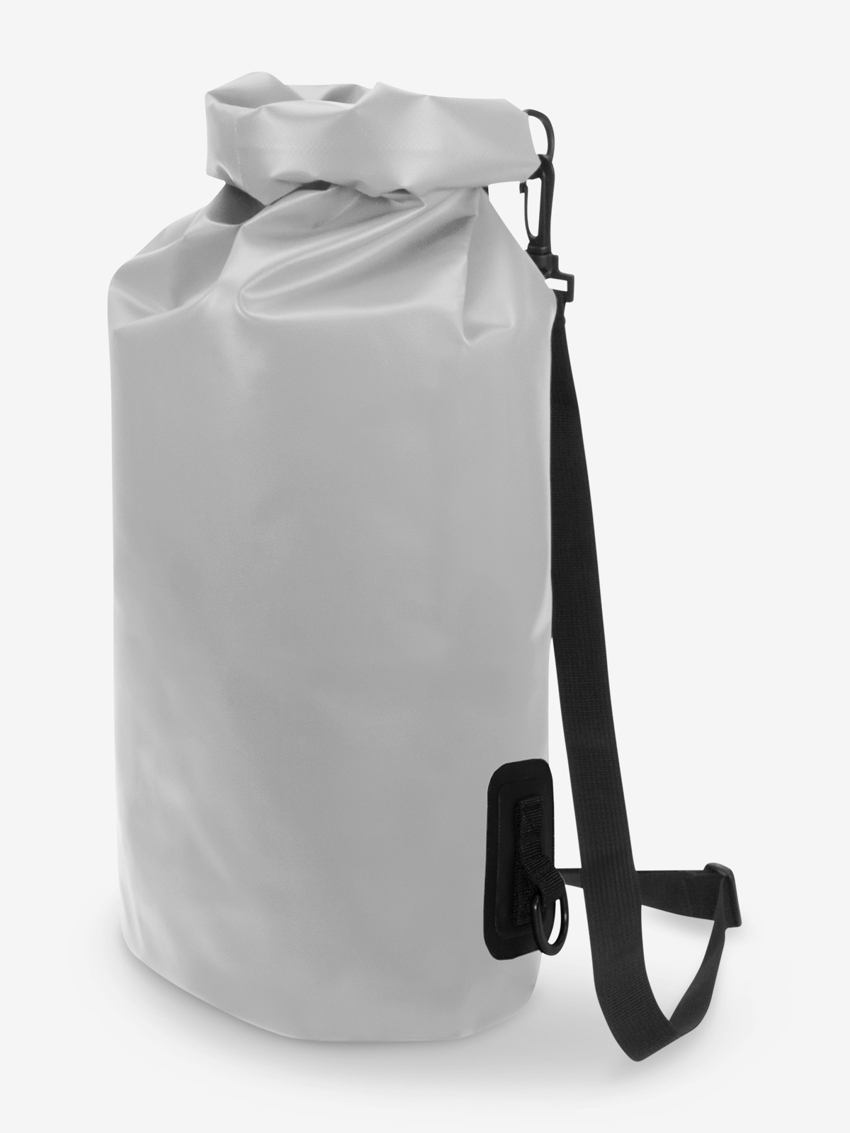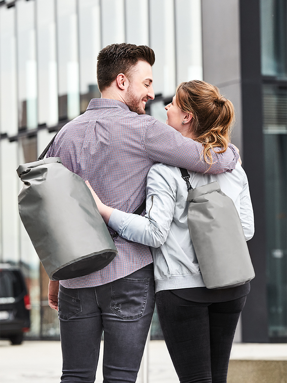 Or to put it even better: If you are already standing in the rain at least everything will stay dry. Whether in a light drizzle or strong showers: this soft tarpaulin bag is in its element in wet weather. Water-resistant, with welded seams and equipped with a smart roll closure: this bag is the recommended tip for adventure seekers. Hip promotional media for travel, outdoors, youth or city marketing. Also available in a larger size with #1809787.