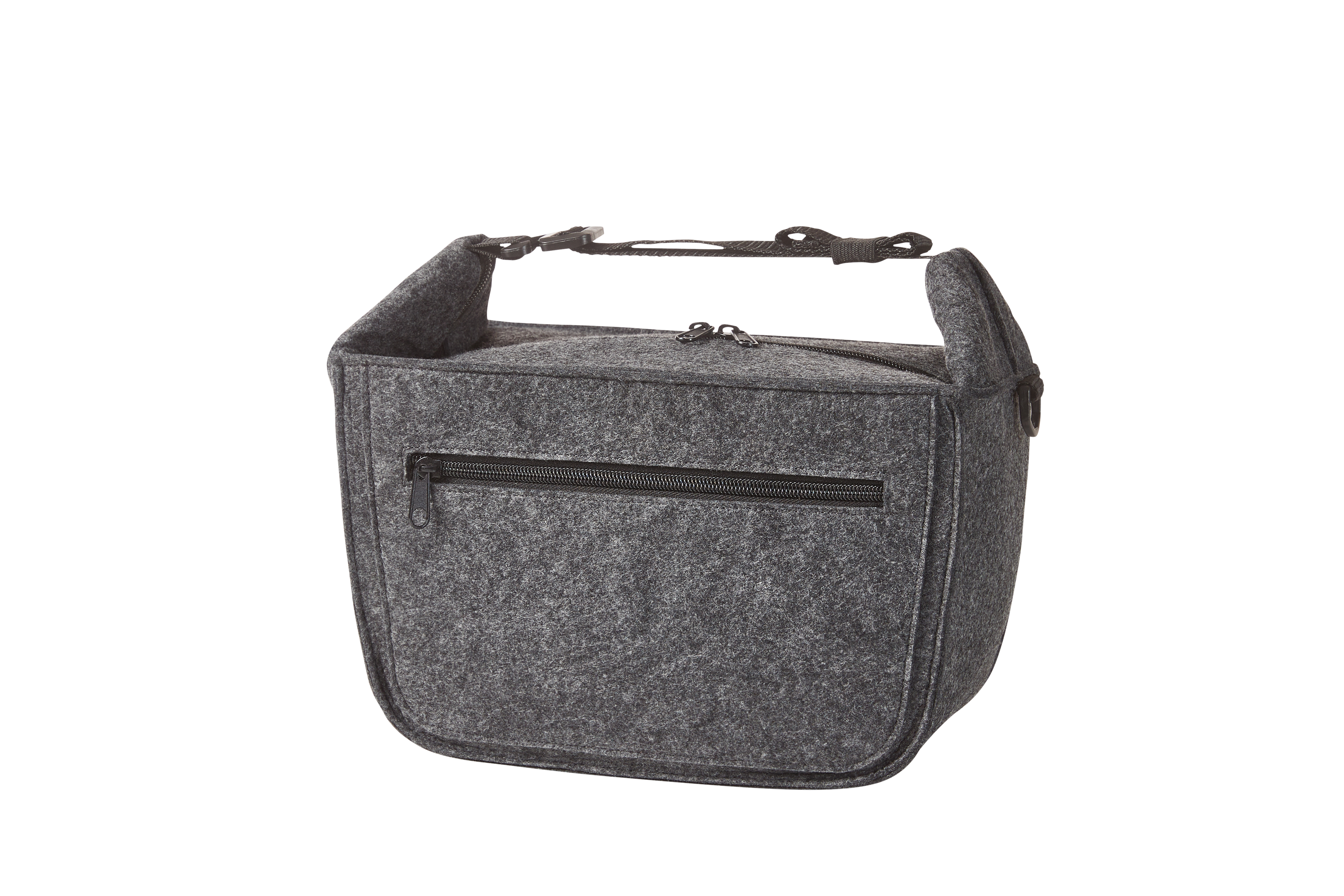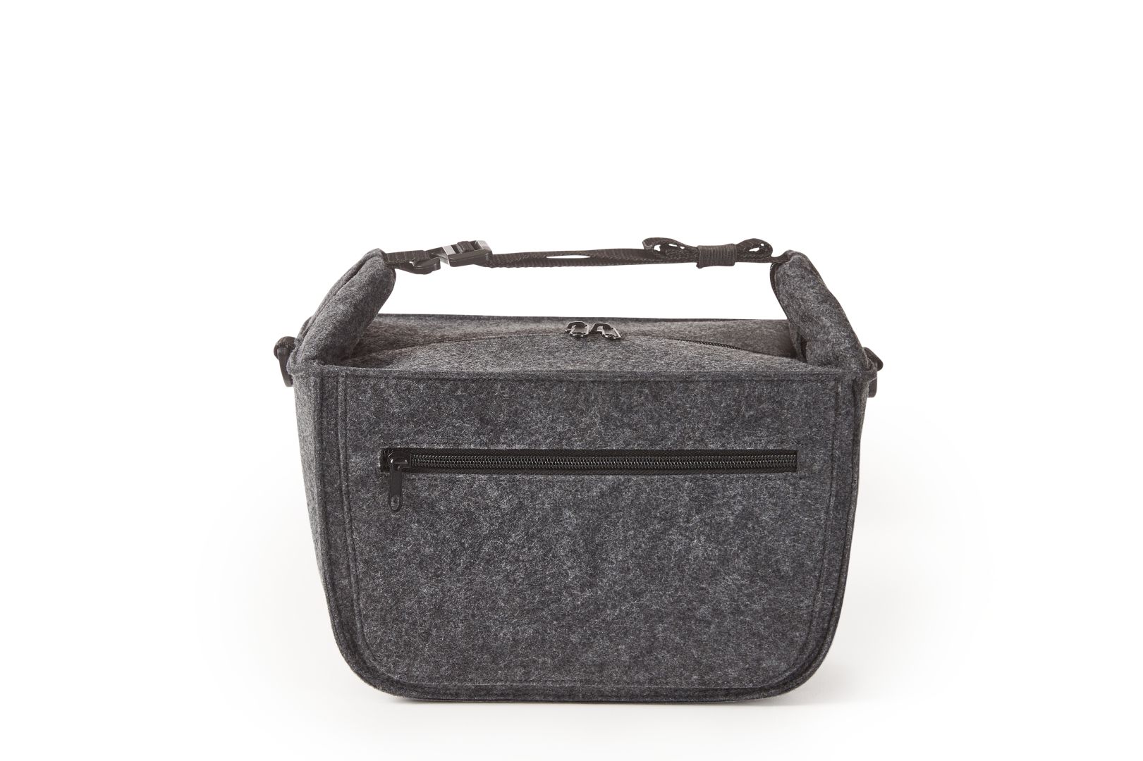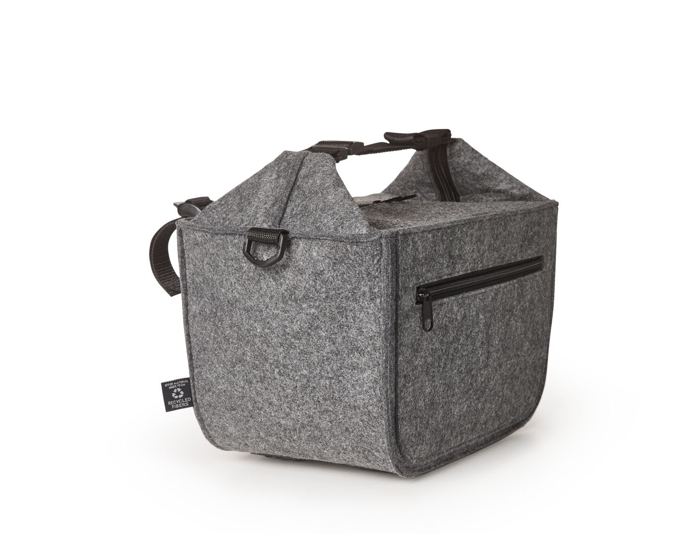 timeless felt cooling bag; main compartment with 2-way zipper; generously padded; washable inside; detachable, length-adjustable strap on one side with G-hook and rubber tab for strap attachment; D-rings on both sides for attachment of optional shoulder strap* or keys for example; bottom feet; loops on back for attaching to bike handlebars